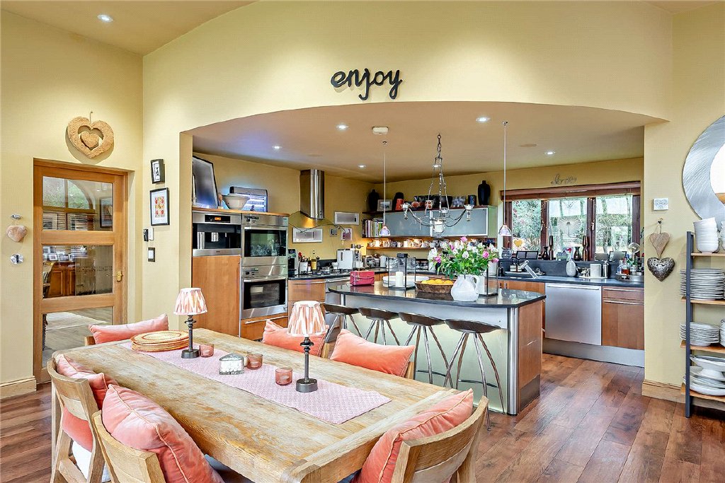 Spanning three floors, the accommodation is both generous and versatile, ideal for family life and entertaining with each room enjoying the magnificent setting. Entry is via steps from the driveway leading to the front porch. The ground floor features a spacious entrance hall with a stained-glass panel overlooking the indoor swimming pool below. This leads to the principal drawing room, a beautifully proportioned space with terrace access and the lovely feature of the original large open brick fireplace. At the other end of the house are a sitting room and formal dining room, connecting to the kitchen/breakfast/family room, the heart of the home a perfect space for everyday living and entertaining. The kitchen includes an island unit, pantry, and integrated Miele appliances, while the sitting and dining rooms benefit from dual aspect views. All these rooms open onto an expansive terrace, perfect for alfresco living. A cloakroom and utility room complete the ground floor.