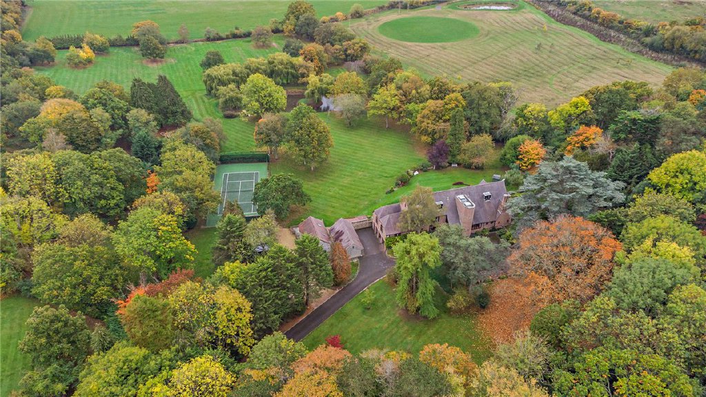 Formal gardens and terracing, enhanced by exterior lighting, are laid out beside the house and gently slope down toward a picturesque lake. A stream meanders through the grounds, feeding into a pond and eventually the lake, which features a central island and fountains. The grounds also include a five-hole golf course, a recently resurfaced, floodlit hard tennis court, additional garaging and storage sheds. A charming summer house is perfectly positioned to capture the evening sun and panoramic views of the grounds. Two gates along the perimeter of the property offer direct access to the adjoining Bagley Woods, further enhancing the sense of seclusion and natural beauty.