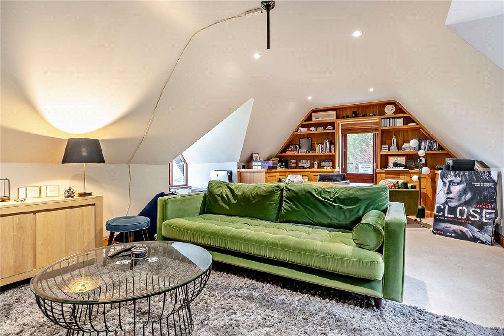 The second floor has been designed as a flexible annexe or workspace in mind. It includes a bedroom with sitting area, two bathrooms, a study/storage room, and a further bedroom currently set up as a home office with its own sitting area, ideal for remote working or guest accommodation.
