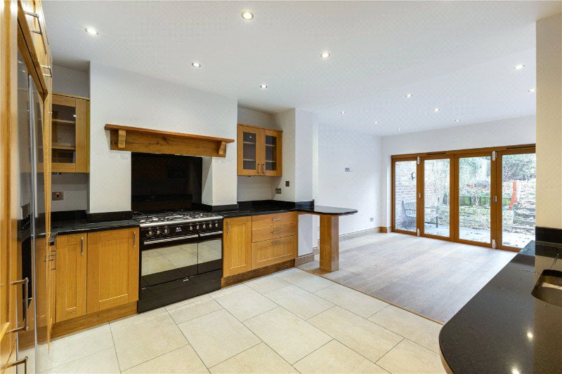 The property features a spacious reception room with high ceilings and large windows, creating a bright and comfortable living area. To the rear, a separate dining room leads through to a well-appointed kitchen fitted with solid wood cabinetry, stone worktops and integrated appliances. Bi-folding doors open directly onto a private patio, allowing a seamless connection to the garden.