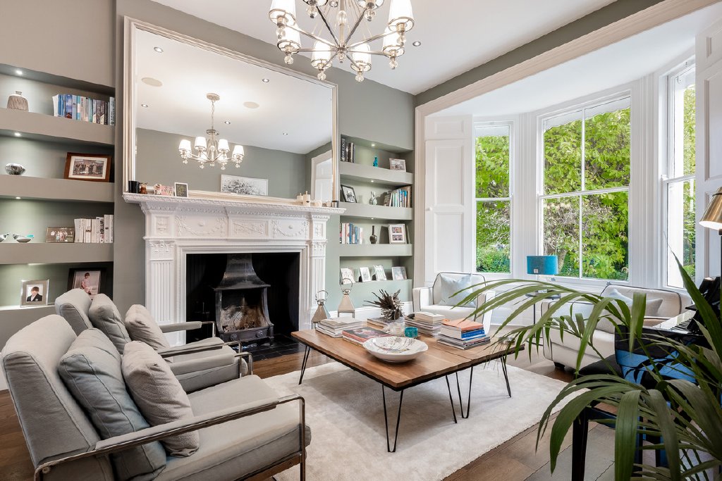 The entrance hallway gives a glimpse of the high standard of finishings on offer throughout this exquisite home and leads through to the substantial drawing room to the right and the formal dining room to the left. The opulent drawing room is flooded with light from a large bay window to the front and features an open fireplace with beautiful surround and recessed shelving to either side, hard wood flooring and continues through to the rear of the property with a window overlooking the garden.