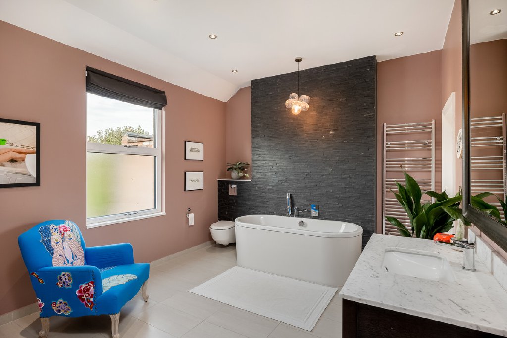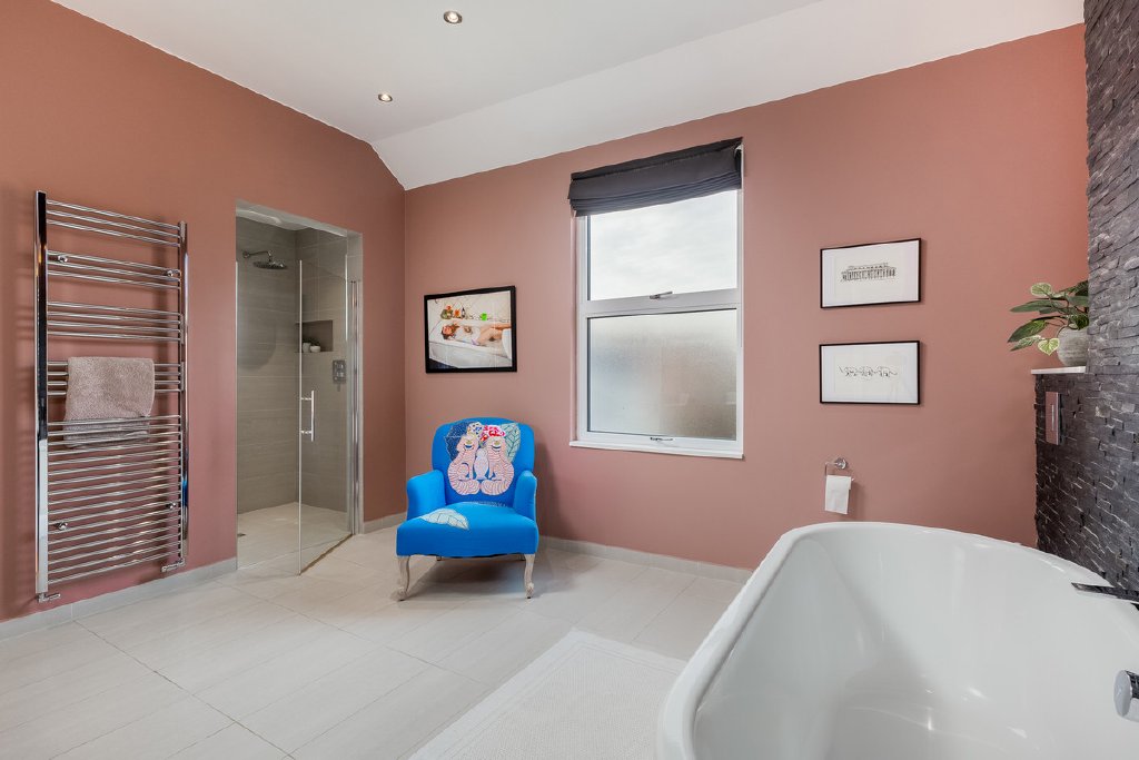 The family bathroom is of a very generous size and has a striking feature wall with freestanding bath and separate walk-in shower.