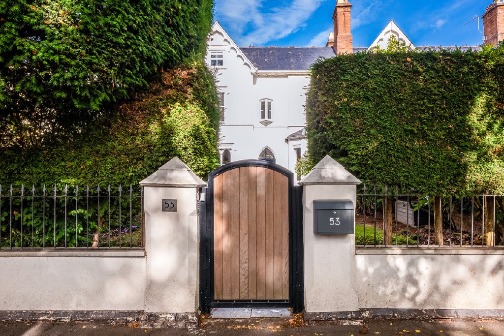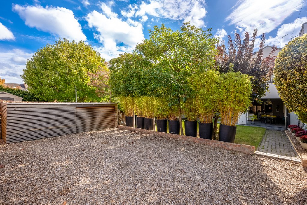 A large beautifully manicured front garden sets the house back from the road and mature trees and shrubs provide a good degree of privacy. Parking is to the rear of the property via electric gates which lead to a gravel driveway with parking for two vehicles, electric vehicle charging point and a bike store for up to six bikes.