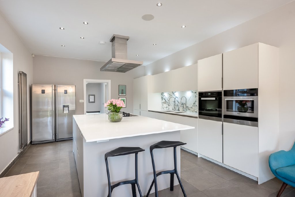 Stairs off the entrance hall lead down to a guest cloakroom and the stunning open plan kitchen, dining and family room. The beautiful handleless kitchen features a large central island with breakfast bar seating and all the integrated appliances you would expect from a modern family home including a gas hob with extractor above, double Miele ovens and dishwasher. The spacious dining area with two sets of bifold doors connect the room with the outside terrace and garden beyond making this the ideal space for entertaining family and friends or sharing a relaxed family meal.