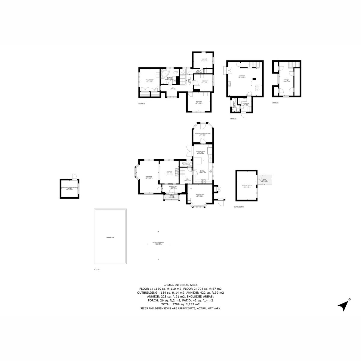 The lawned garden is fully enclosed and dog-proofed, a heated swimming pool perfect for the warmer months, and a detached cabin ideal for home working, fitness, or hobbies. Additional outbuildings include a pump house/storage and two further storage sheds.