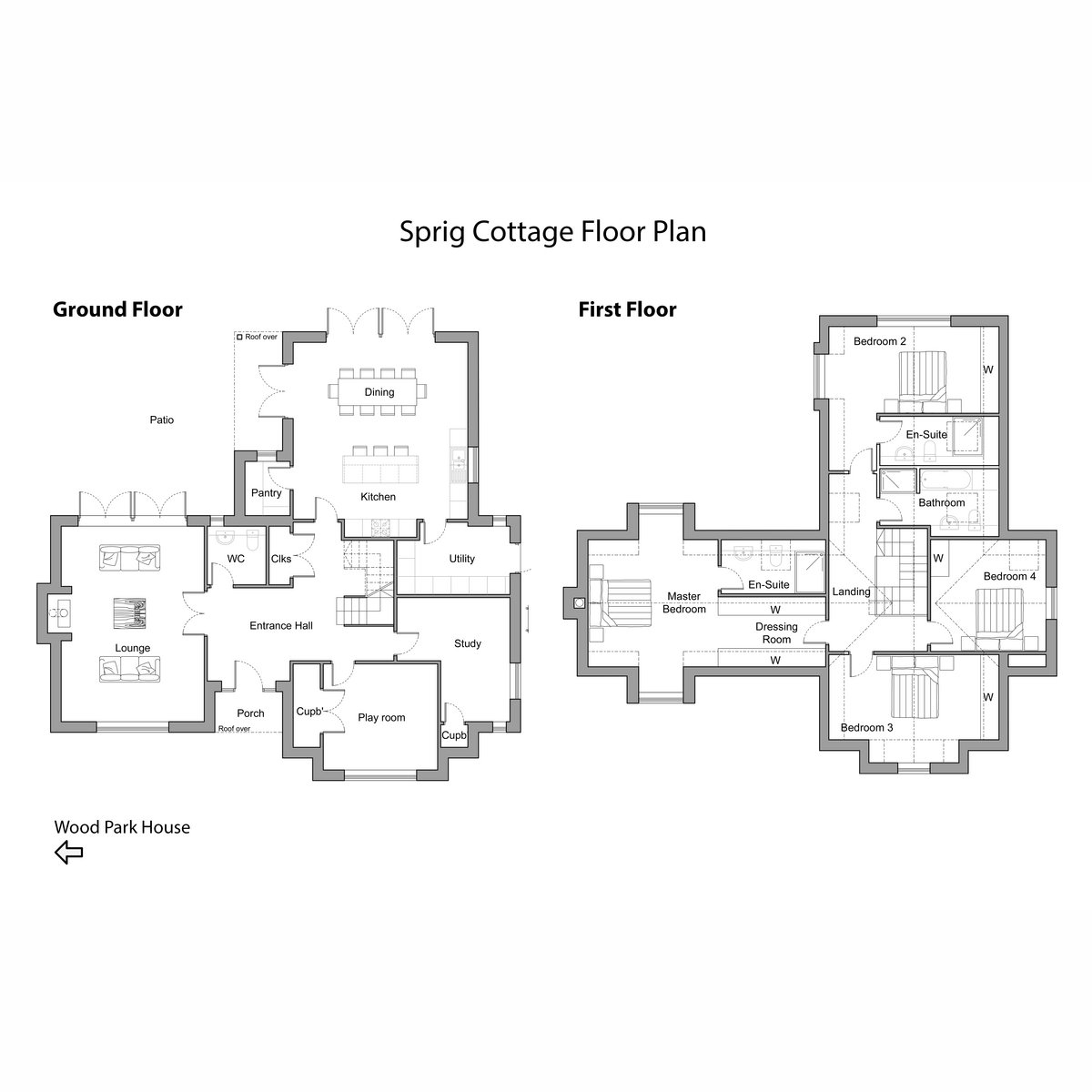 Sprig Cottage is a separate dwelling with full planning permission to replace it on a large sized plot with a substantial four-bedroom, kitchen/dining area, three bathroom (two en-suite), three reception room home. Wood Park House and Sprig Cottage offers buyers an exciting and rare opportunity within the existing curtilage for two, four bedroom family homes.