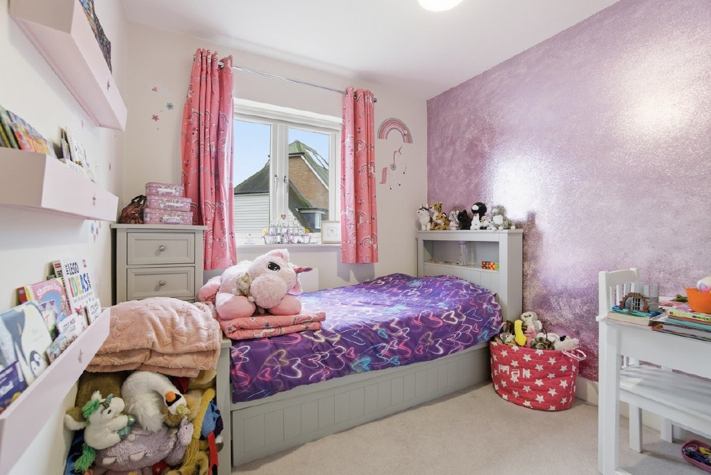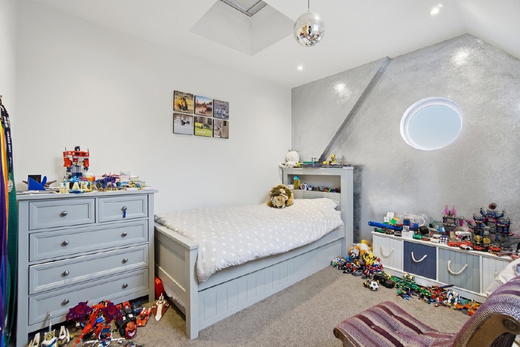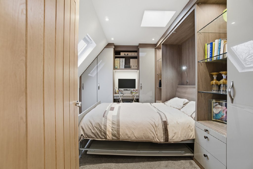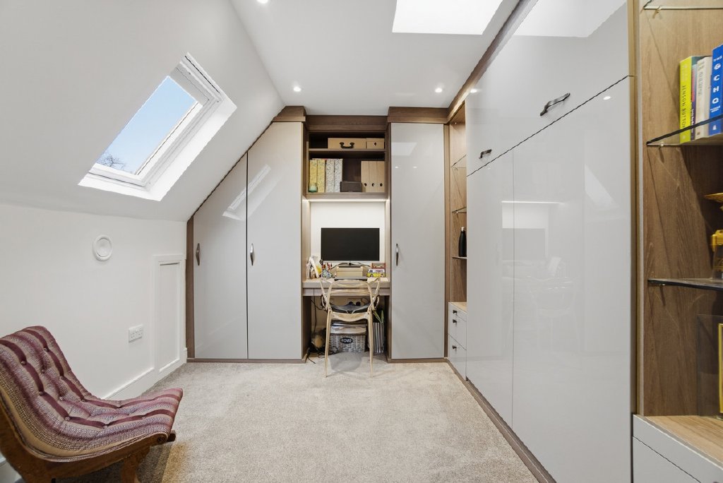 The top floor is where the 2019 loft conversion truly delivers. The entire space was professionally converted to create a fourth bedroom, dedicated shower room, and a versatile additional room currently used as a home office and overflow space for guests. This room includes one entire wall that features integrated storage, shelving, and a pull-down bed, clever design that maximizes functionality. Work from home during the week, accommodate guests when they visit, or simply claim it as your escape when family life gets loud downstairs. Practical eaves storage throughout this level adds further utility.