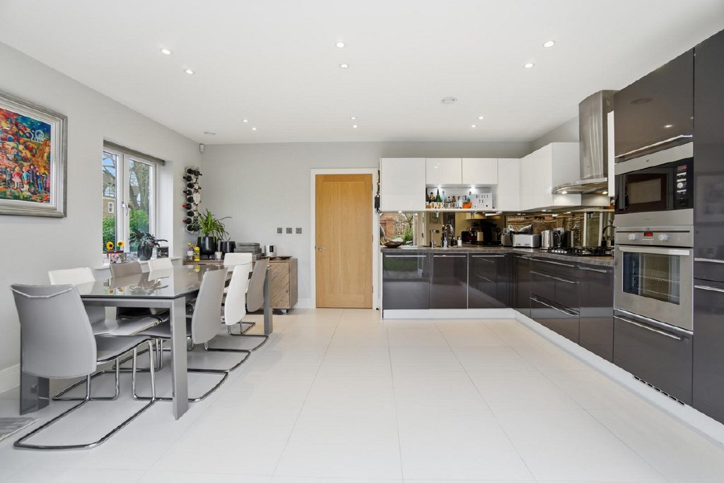 The south-east orientation captures natural light throughout the day, while bifold doors between the kitchen and garden create genuine indoor-outdoor living space. The ground floor layout works well for family life. An open-plan kitchen and dining area forms the heart of daily living, well-appointed with high-specification appliances and good storage. A separate reception room provides quieter space when needed.