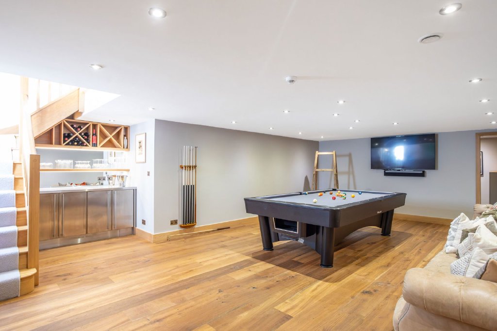 and soft seating gathered around the wood burner and large screen - a wonderful space for a get together. The basement floor offers something for everyone; a media room for watching a film or big match, a pool room with drinks station, gym, shower room, large walk-in wardrobe and a second home office or hobbies room.