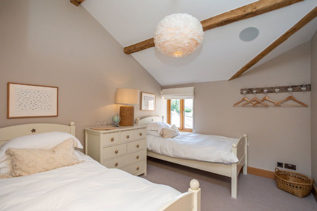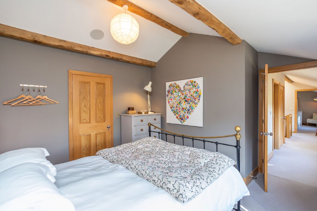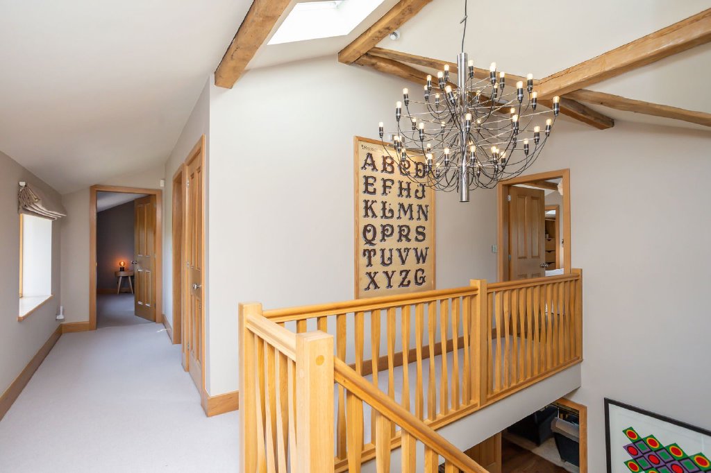 The specification features extensive use of oak throughout the house, including made-to-measure paneled doors, elegant custom-made staircases, double glazed window frames and French doors, Ted Todd engineered oak flooring, deep skirting boards with complementary architraves and window cills and exposed beams and roof trusses. The flooring and surfaces are finished with a variety of carefully selected natural stone tiles, echoing the surrounding rural landscape. The main kitchen is classically styled with timeless hand-painted cabinets from Simpsons of Greenfield Mill, Colne and the sanitaryware is high quality Duravit with Hansgrohe shower fittings. Although new build, certain elements of construction such as the flags and bricks were repurposed from heritage properties to give an appearance older than its years.
