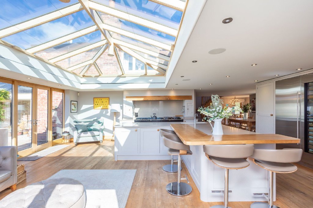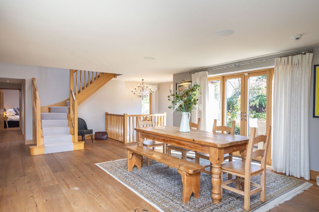 At the heart of the home is a spectacular open-plan living kitchen, where light floods in from all angles thanks to extensive floor to ceiling glazing. Beautifully appointed with handcrafted cabinets including a working island unit, breakfast bar and a concealed breakfast station and bar along with high specification appliances, this is a space made for modern family life - equally suited to quiet mornings, lively family meals or entertaining guests. Cook, dine and relax in comfort, with four sets of French doors opening directly onto the garden, the lines between inside and out become blurred. Double oak doors lead into a separate sitting room with a Contura wood-burning stove - a warm and inviting retreat, which can be opened to extend the living space or closed off for cosy evenings.