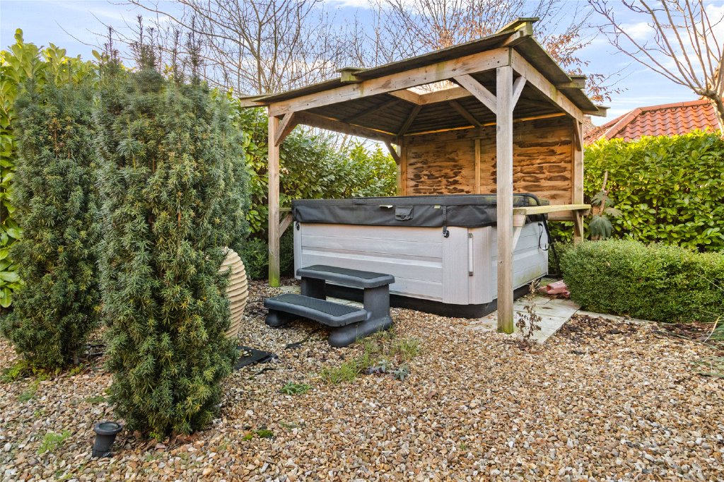 - Stone Flagged Patio, Hedging + Covered Hot Tub Area