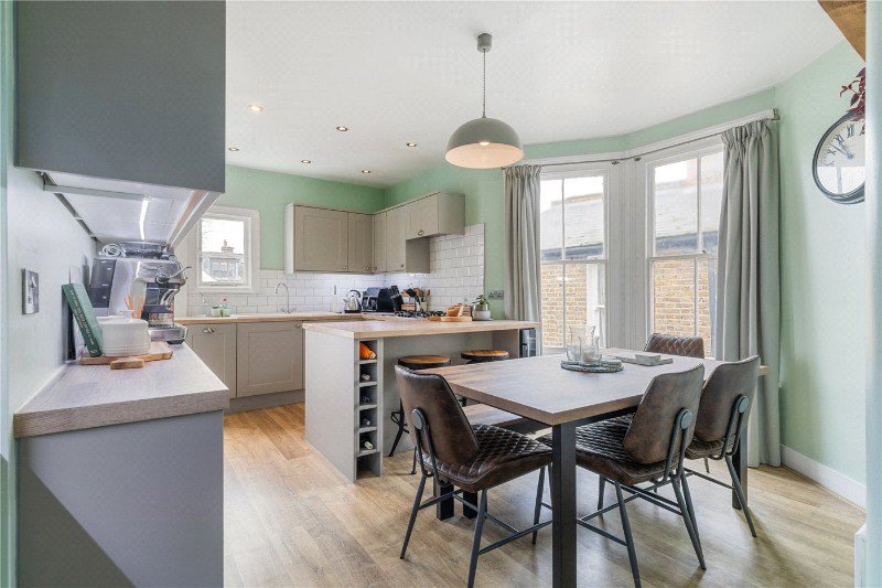 Upon entrance from the ground floor, a staircase leads up to a spacious hall and to the rear is an impressive open plan kitchen dining room. Filled with an abundance of natural light thanks to dual aspect windows and large bay window to the side, the kitchen itself has been beautifully finished, fitted with plenty of wall and base units and modern integrated appliances with the space thoughtfully divided up by a breakfast bar. Offering plenty of additional space for a dining table making it perfect for entertaining as well as everyday family living. Through the kitchen, stairs lead down to a private and low maintainence garden, perfect for alfresco dining. Across the front of the property is a wonderful reception room, featuring a large bay fronted window which boasts clever alcove seating with additional storage and elegantly finished with built in shelving, a fireplace with wood burner and hardwood flooring.