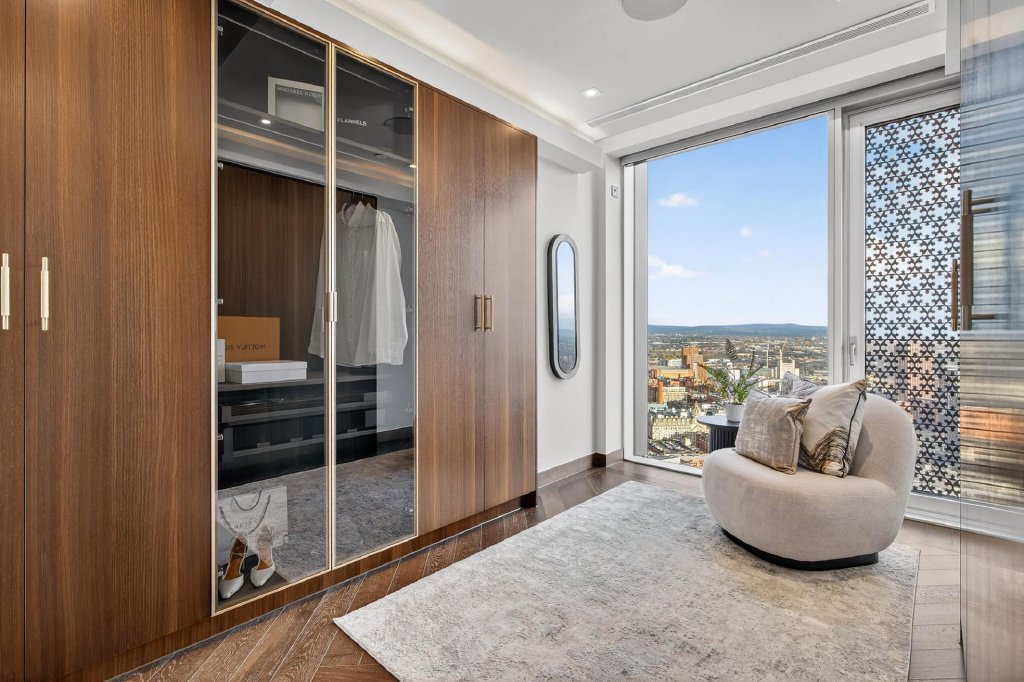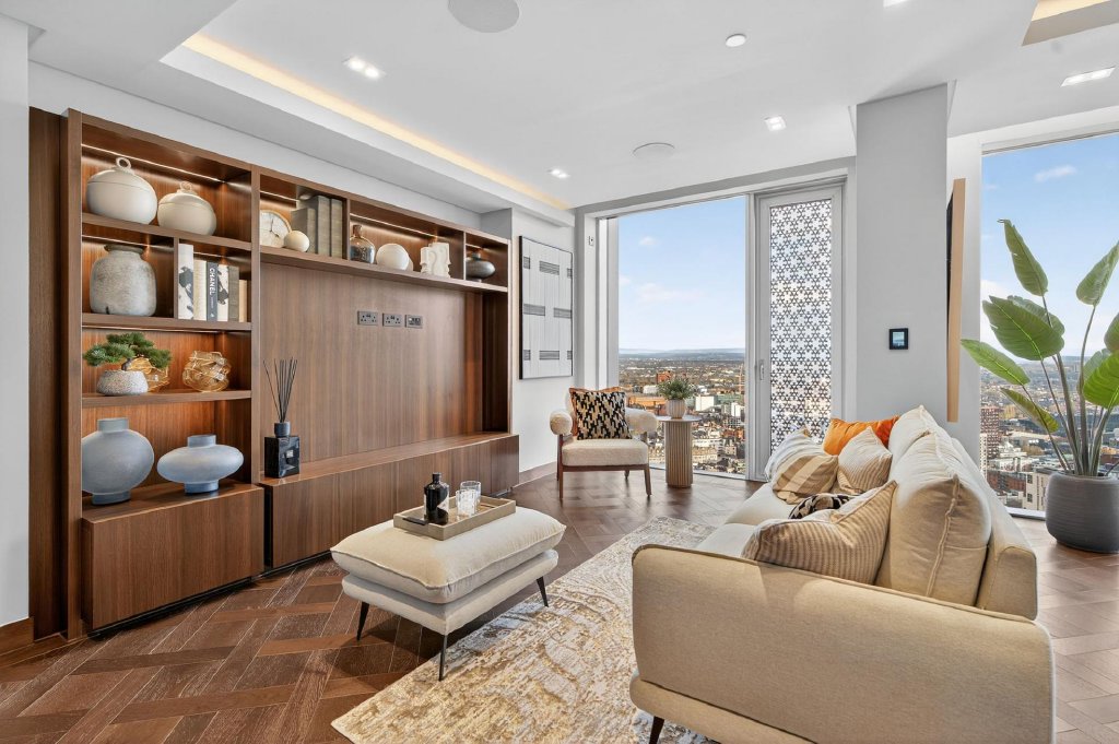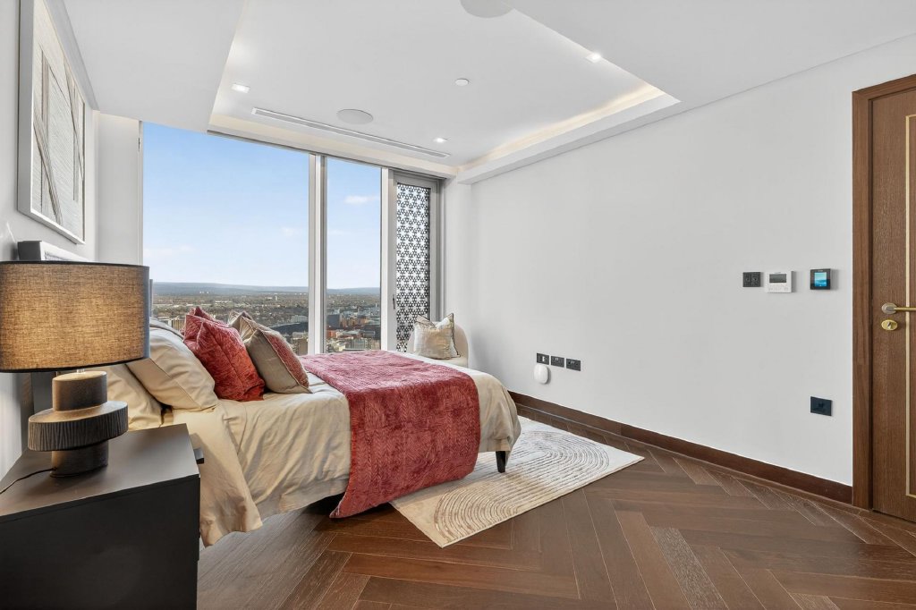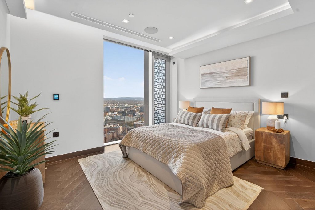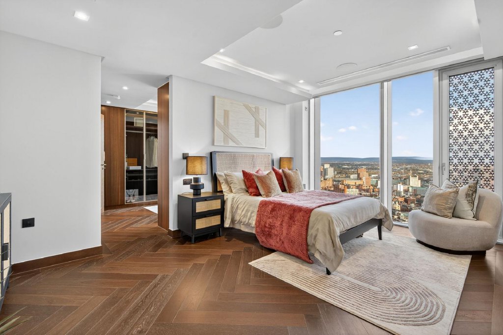 The lower level is dedicated to rest and relaxation. The principal bedroom suite is a standout feature, with floor to ceiling windows offering uninterrupted views across Manchester, a separate bespoke dressing room with fitted wardrobes, and a five piece en suite bathroom featuring a freestanding bath, walk in shower and his and hers sinks. A further guest bedroom benefits from fitted wardrobes and its own three piece en suite, providing hotel style comfort and privacy.