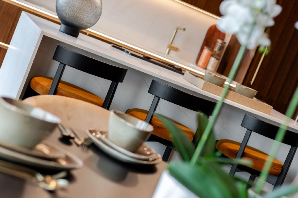 The penthouses at Viadux represent the pinnacle of city living, offering exceptional space, privacy and panoramic views across Manchester. Arranged over two levels, the penthouse is designed to balance open plan entertaining with private retreat. The entry level features a beautifully appointed kitchen with Miele appliances, fully integrated units and an instant hot water tap, flowing into the dining and lounge areas where floor to ceiling glazing frames the city skyline. A glass fronted home office provides a dedicated workspace that remains visually connected to the living space, while a discreet two piece cloakroom completes the level.