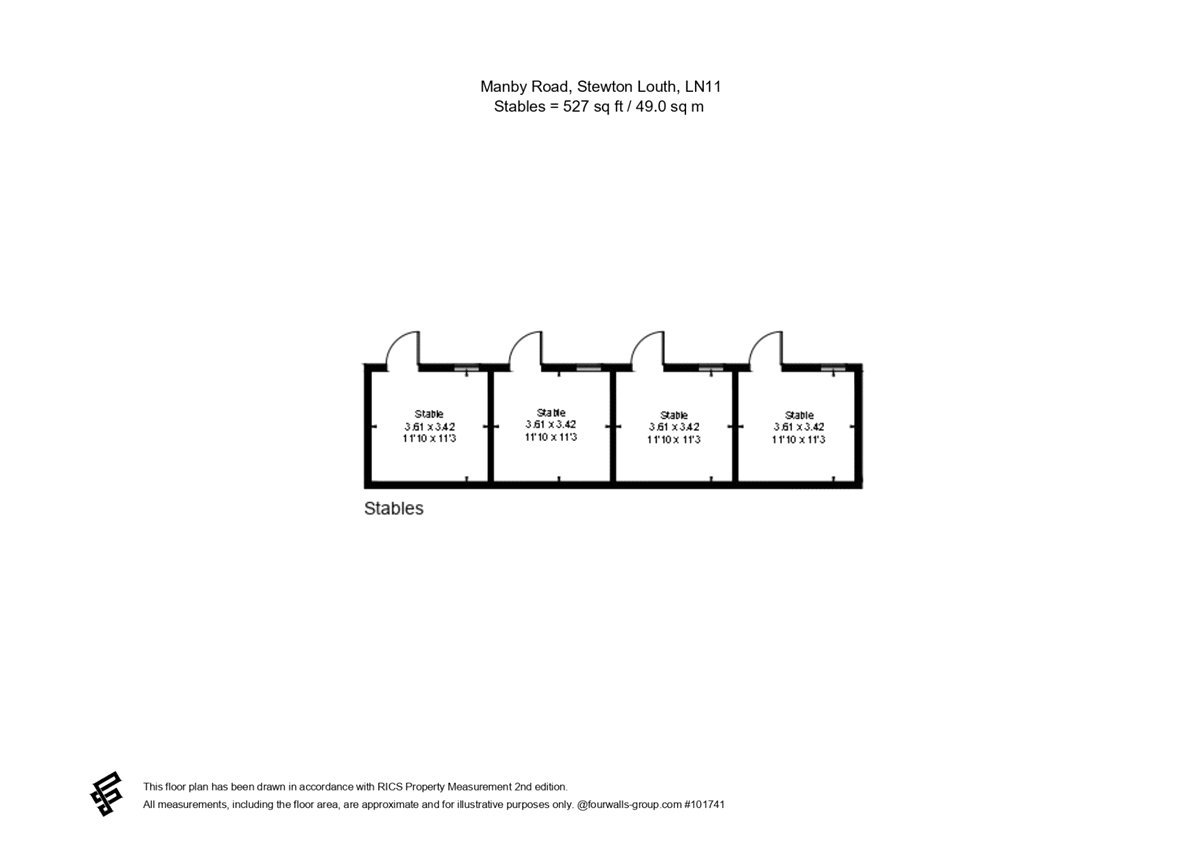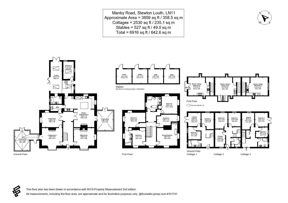 The property sits within approximately three acres of grounds, approached via a long private gravel driveway. The land includes formal gardens, extensive parking areas, a fenced paddock suitable for equestrian or smallholding use, and two stable blocks providing a total of eight stables, extending to approximately 527 sq ft overall.