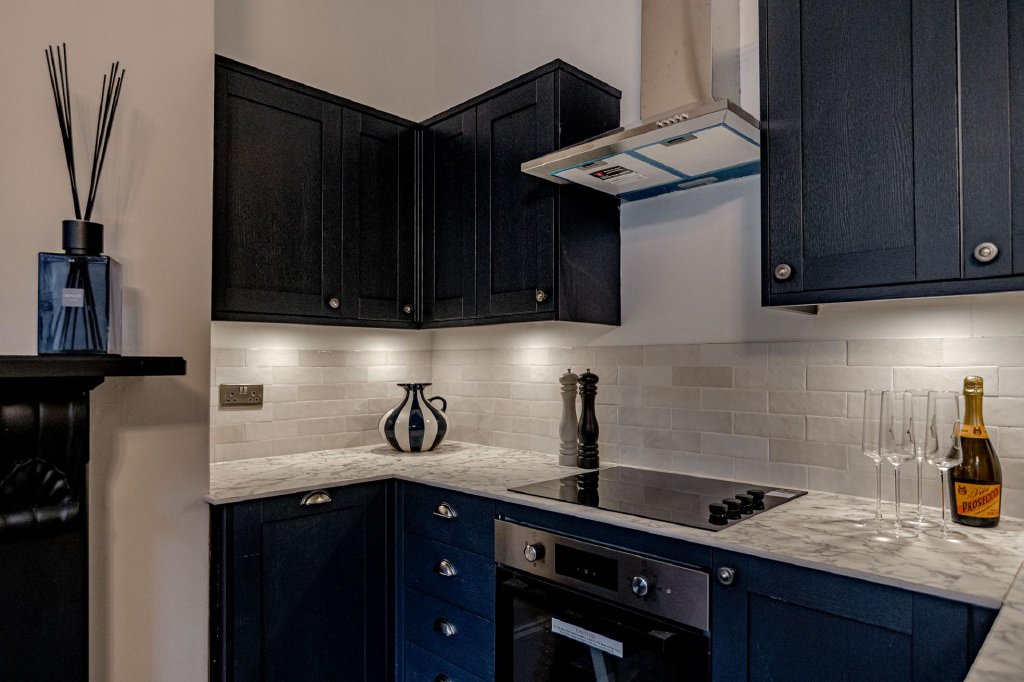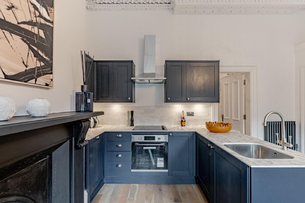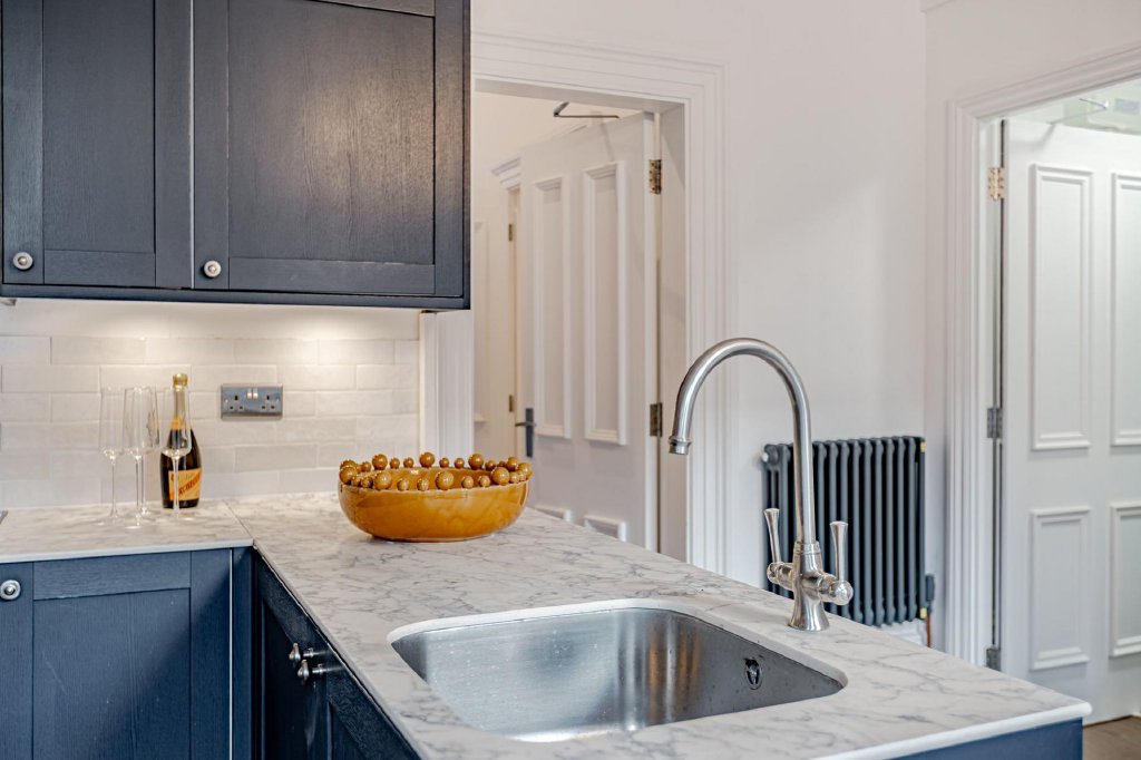 The kitchen is stylishly finished with navy blue shaker-style units topped with a marble-effect work surface. Integrated appliances include an oven, dishwasher, fridge freezer and induction hob, while a natural-toned tiled splashback adds a refined and elegant finish.