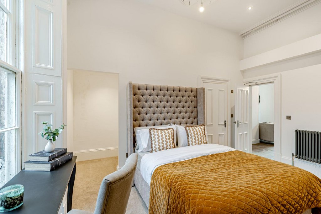 The bedroom is generously proportioned and continues the period charm with another original fireplace. A large recessed area provides the perfect space for a walk-in wardrobe. The ensuite bathroom is well finished and includes a shower over bath, modern tiling and a heated towel radiator.