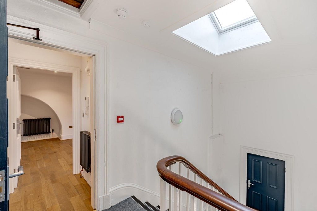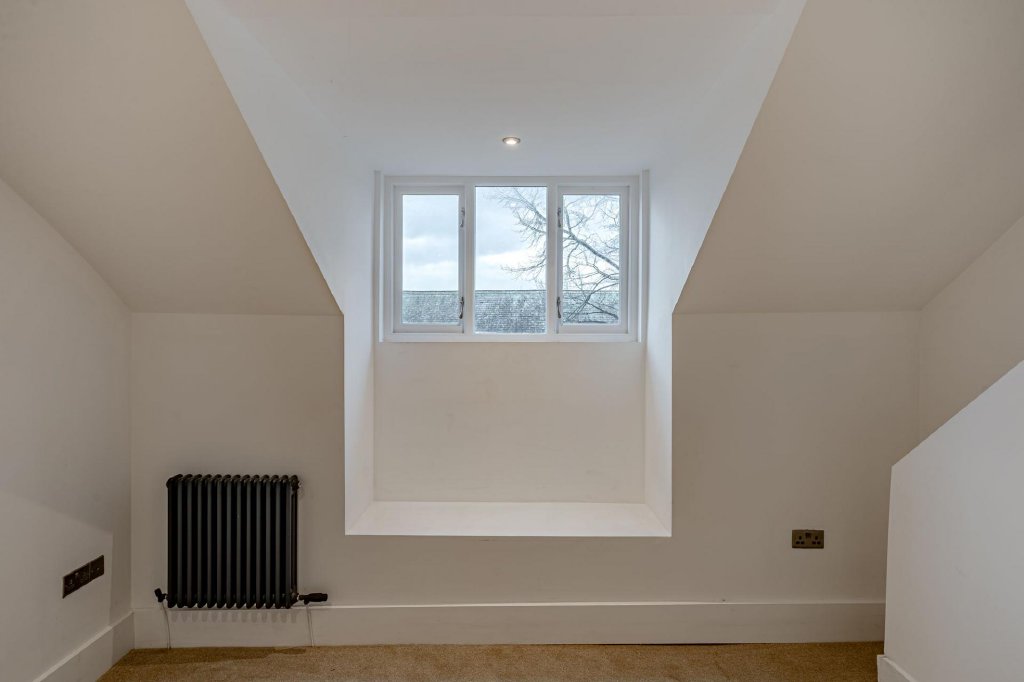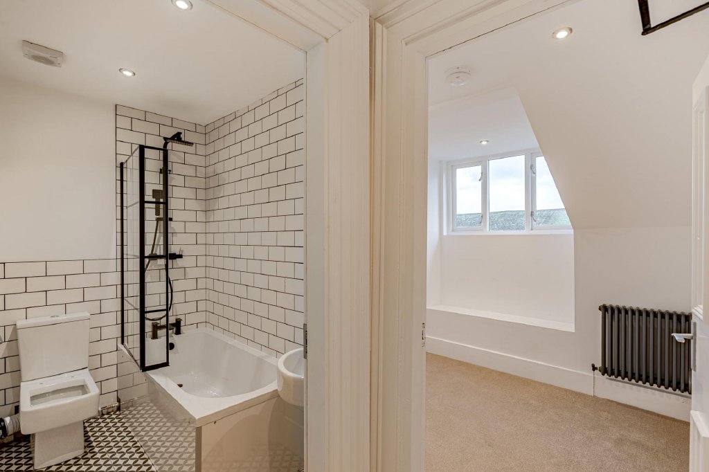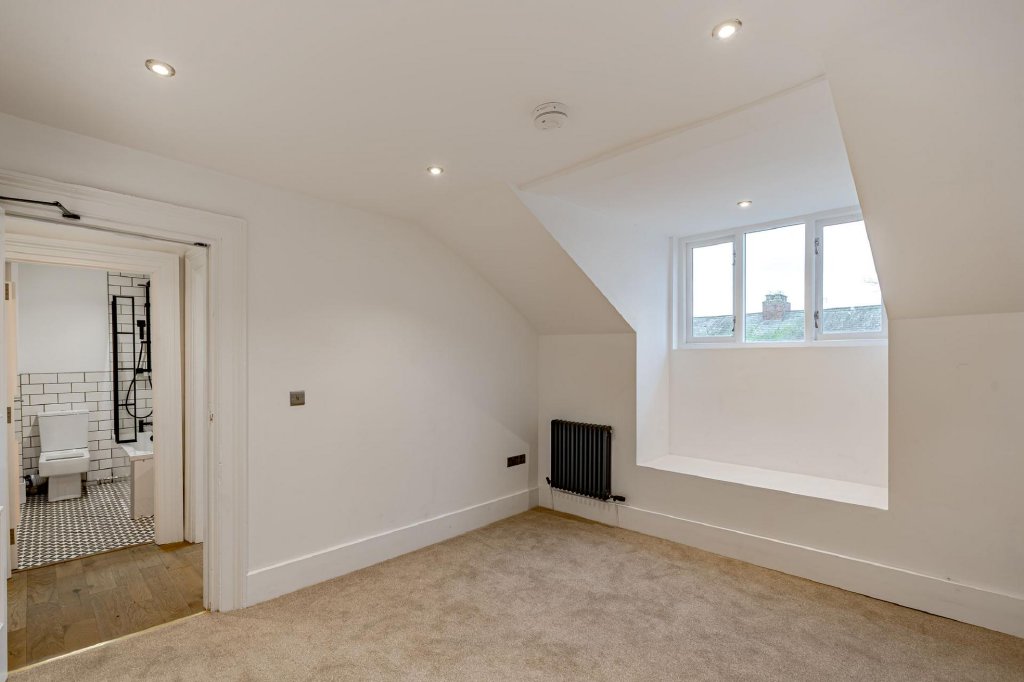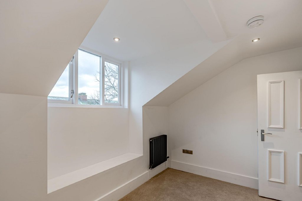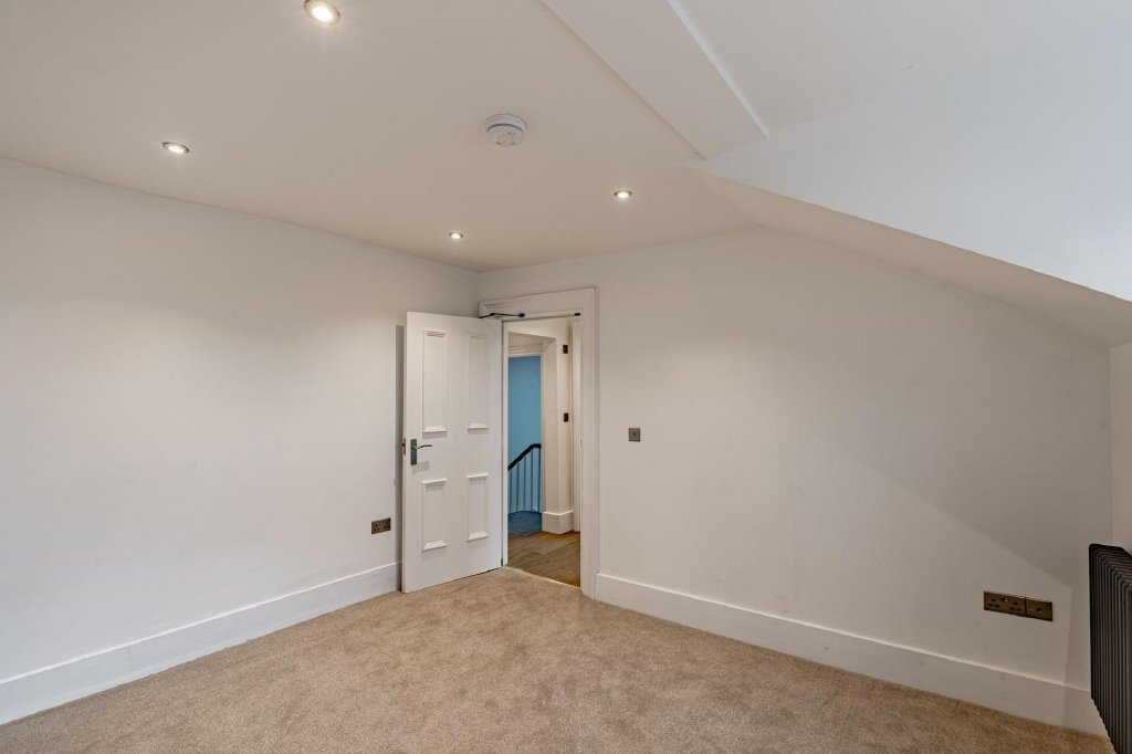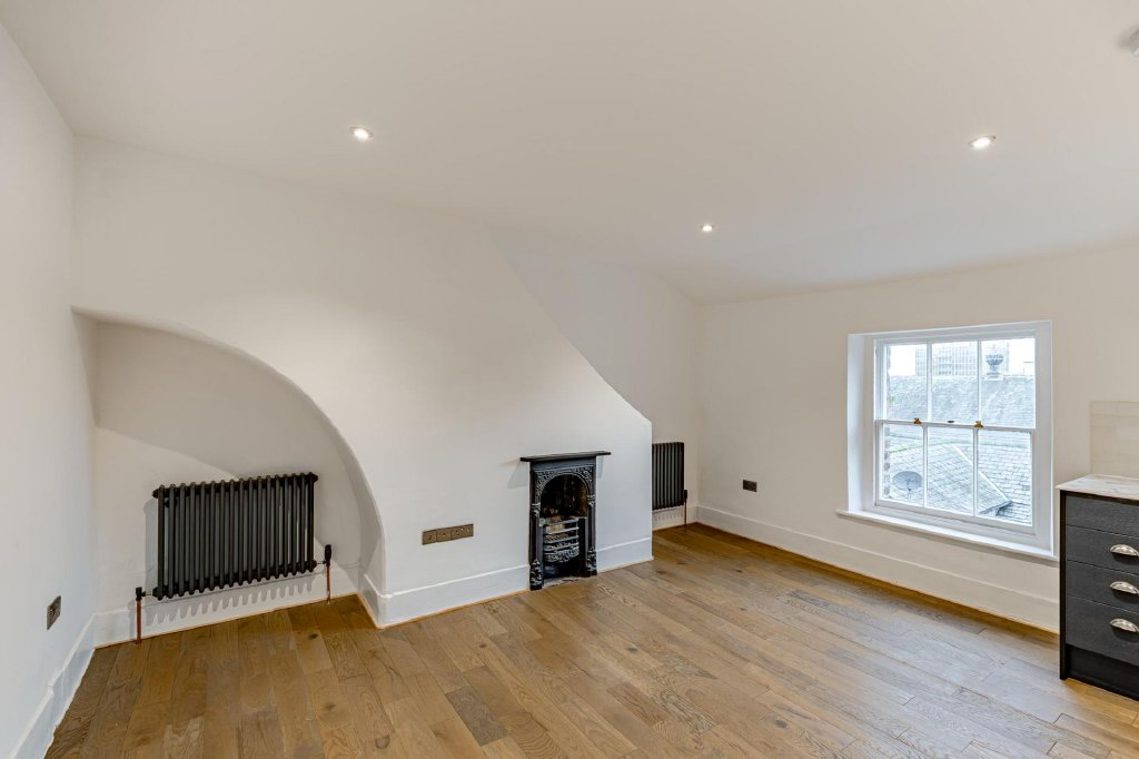 The apartment offers two double bedrooms, both situated on the front elevation and featuring high-level windows designed to maximise natural light. The larger of the two bedrooms also benefits from an original feature fireplace.
