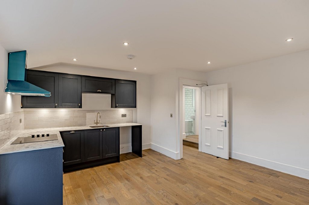 The open-plan kitchen, dining and living space features an original fireplace with an unusually shaped chimney breast, creating a striking focal point. The kitchen is finished with navy blue shaker-style units topped with a marble-effect work surface and benefits from integrated appliances including an oven, induction hob and dishwasher, with space provided for a fridge freezer.