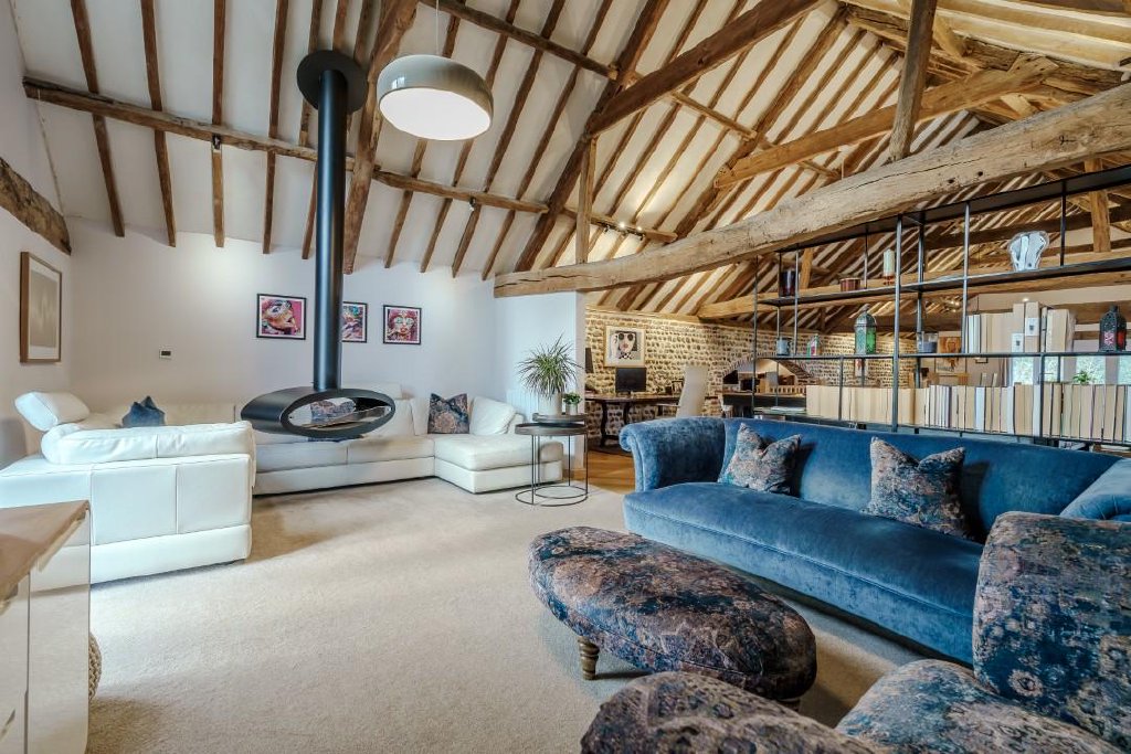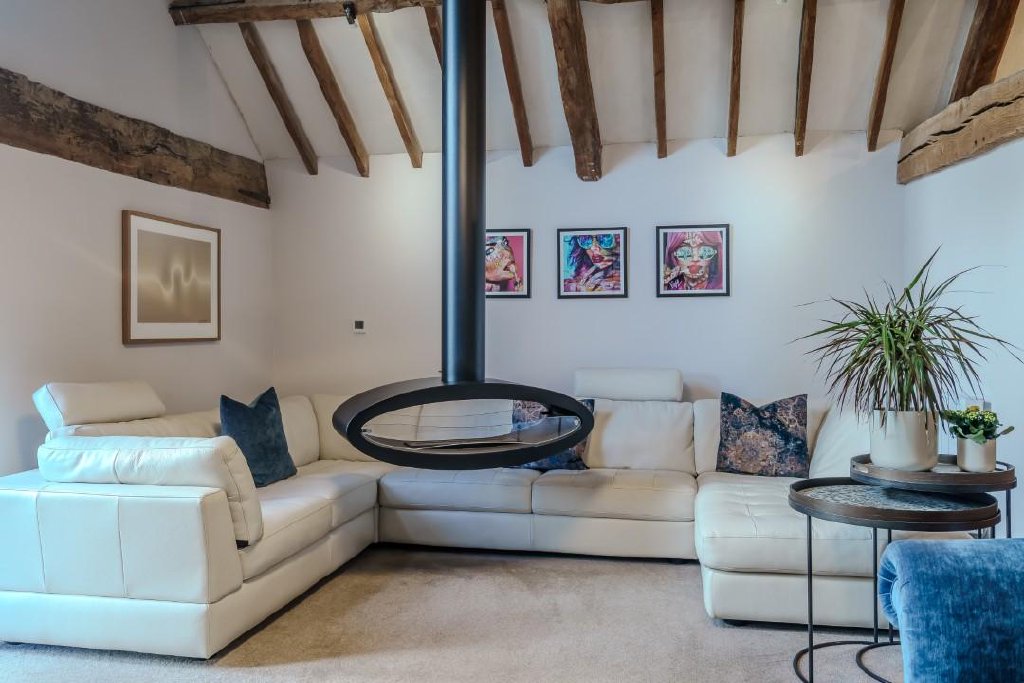 - First Floor Open Plan Living Area with Stunning Rotating Danish Fire and Exposed Beams