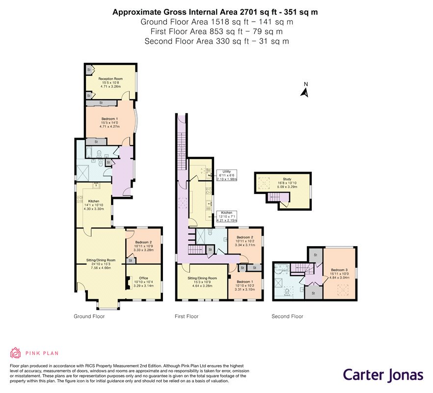 Occupying the entire ground floor, the apartment is particularly spacious, filled with natural light, and provides adaptable accommodation. To the front, there is a large sitting/dining room, a study with wood burning stove, and a double bedroom. A side entrance opens into a hallway leading to the kitchen/breakfast room, wet room, bathroom, a second double bedroom, and an adjoining reception room that can serve as a third bedroom.