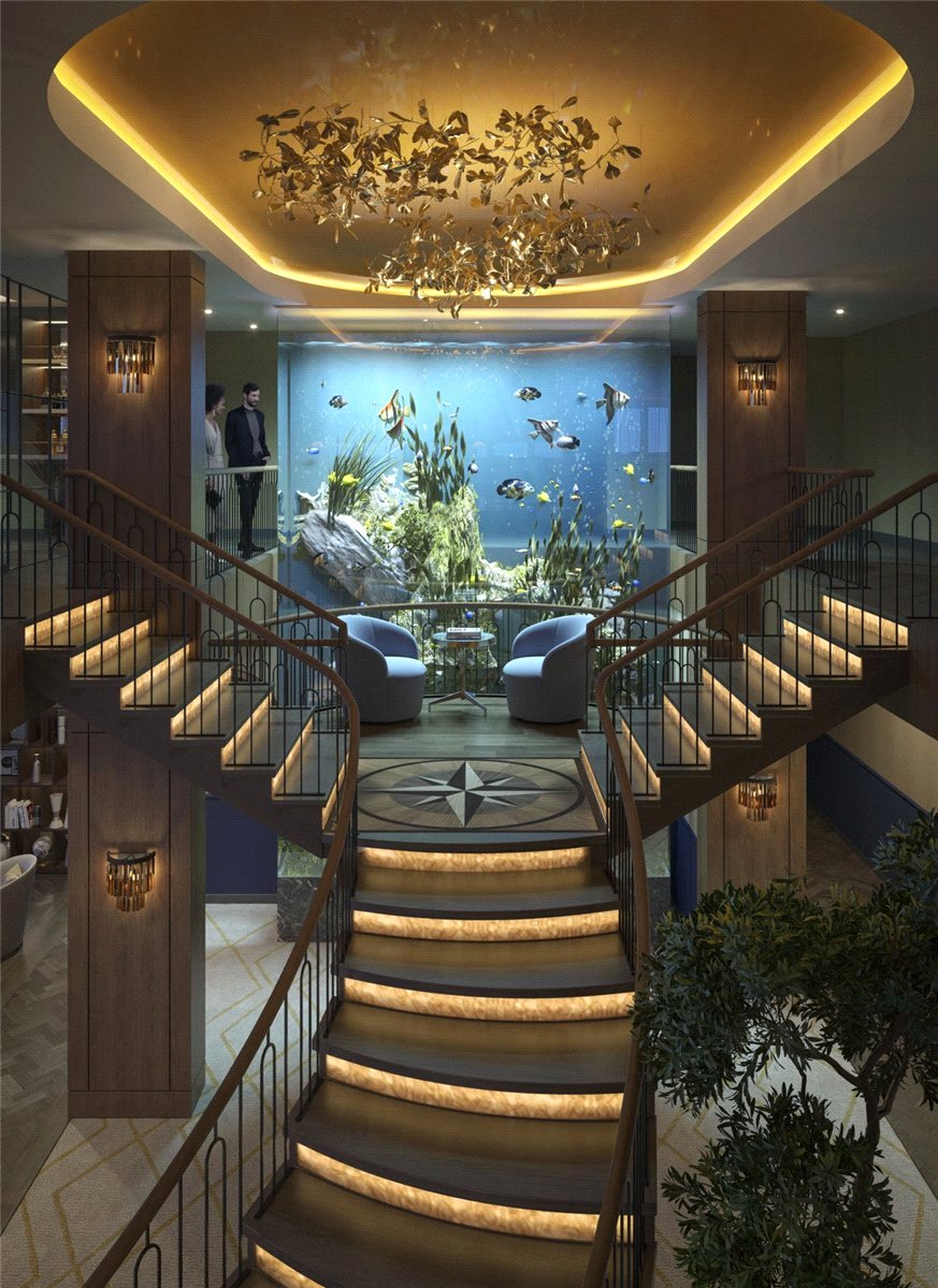 Jade Wharf forms part of the acclaimed London Dock development, a striking project designed by Patel Taylor. Residents benefit from an impressive range of private facilities, including a fully equipped gym, squash court, swimming pool, virtual golf suite, cinema, and elegant lounges designed for relaxation or remote working. The Mauretania Lounge, with its sweeping staircase and striking double-height aquarium, adds an elegant focal point that elevates everyday living.