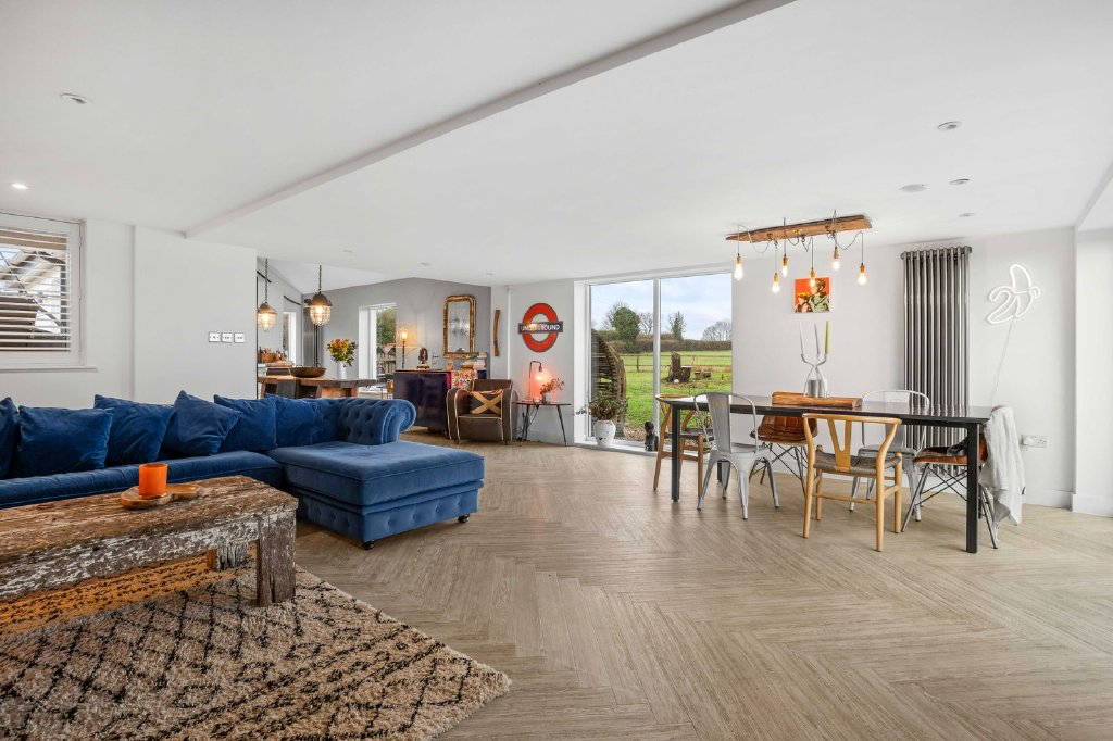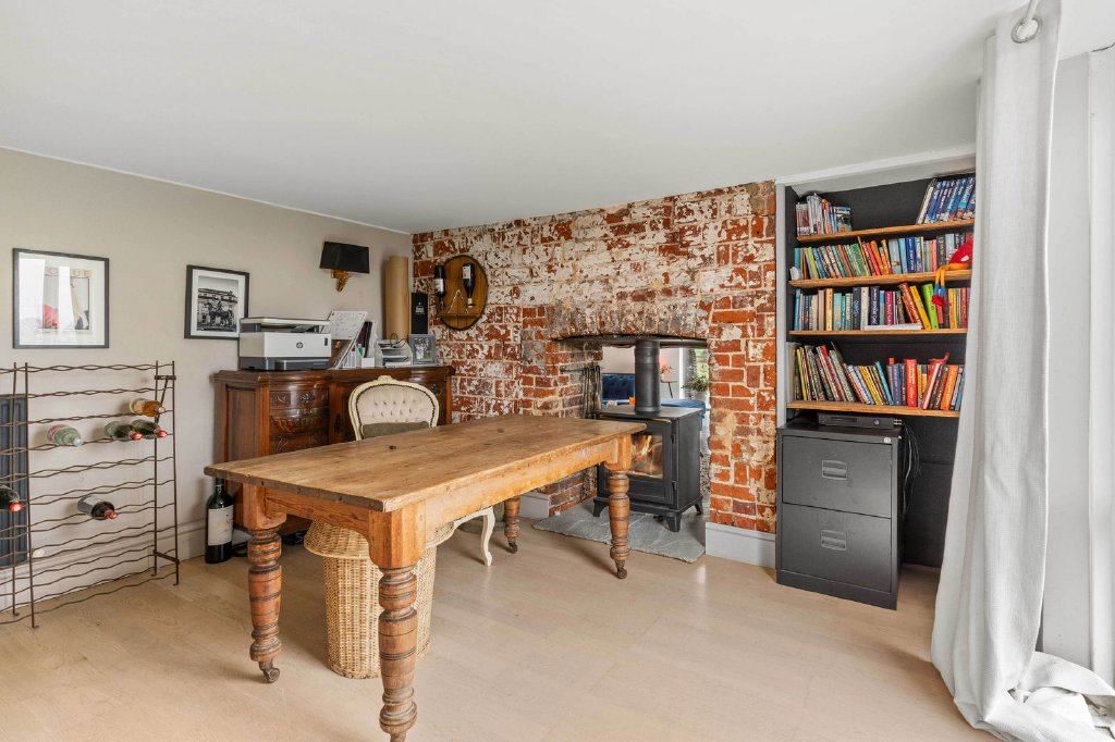 A warm and inviting welcome into the spacious hallway with Herring bone flooring which leads through to the living, kitchen and dining area. There is a utility room with sliding wooden door to the front of the property which was once the kitchen before the new extension was created. A lobby area with space for washing machine and tumble dryer which has a door out to the front of the property, this is an ideal entrance after a long dog walk. There is a fourth bedroom on the ground floor with a modern shower room just off the lobby, ideal for visiting guest, family members and offers a potential to create a separate annexe with a few small changes. To the rear of the property is a family room, this would have been the original living room when it was a cottage, with views over rolling countryside. There is a separate large study with exposed brick fireplace and wood burning stove which connects the original character to the sympathetically designed new extended area.