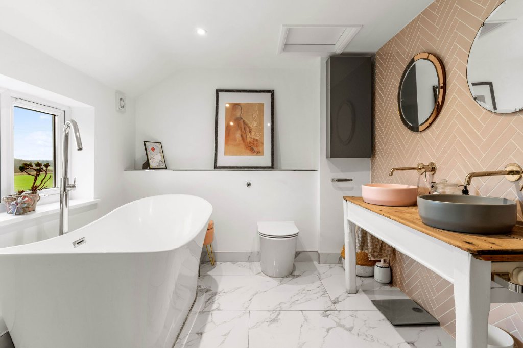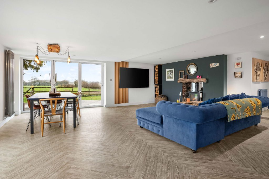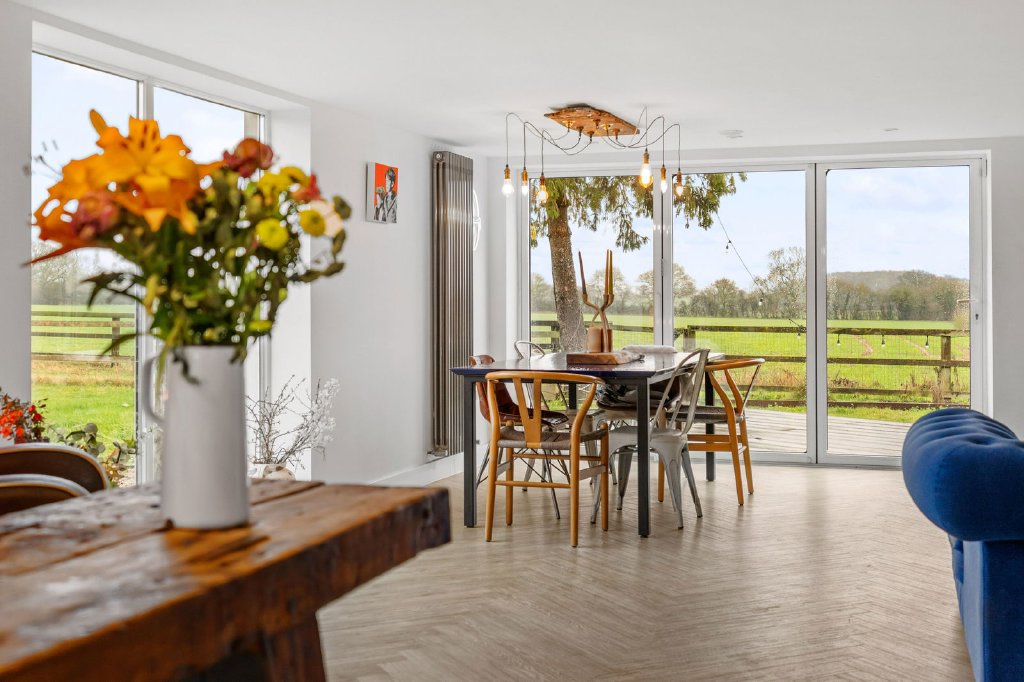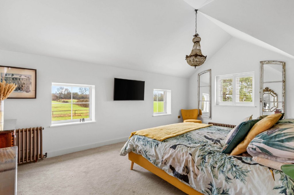 The heart of this home is the large open planned living room with carefully placed large windows and bi folding doors overlooking the garden and countryside. There is plenty of space for dining and entertaining and the kitchen and pantry flow nicely just off the living room. The woodburning stove is a wonderful feature with exposed brick fireplace and really heats the home throughout. On the first floor there are two bedrooms at the top of the landing, one with a mezzanine area where the bed is currently located and allows all the floor space to be utilised. Both bedrooms overlook the countryside, stunning views to wake up too. Just down the corridor there is plenty of built in storage cupboards and a modern family bathroom. There is a doorway leading into the master bedroom with a delightful walk-in wardrobe, fantastic ceiling heights and amazing views from every window. The master ensuite has a free-standing bath just below the window so a bath with a view which is perfectly located, and two vanity sinks and wc.