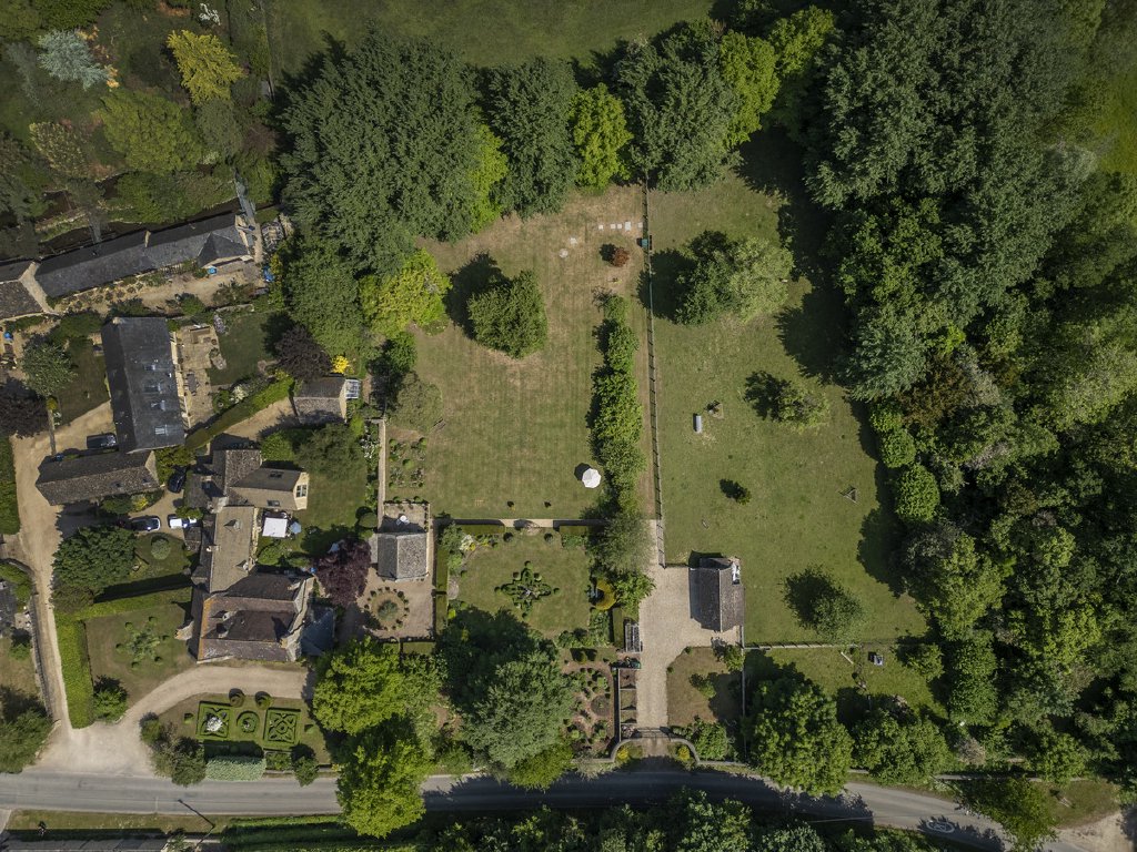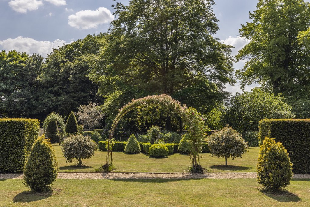 - Formal garden with sculpted topiary and ornamental details