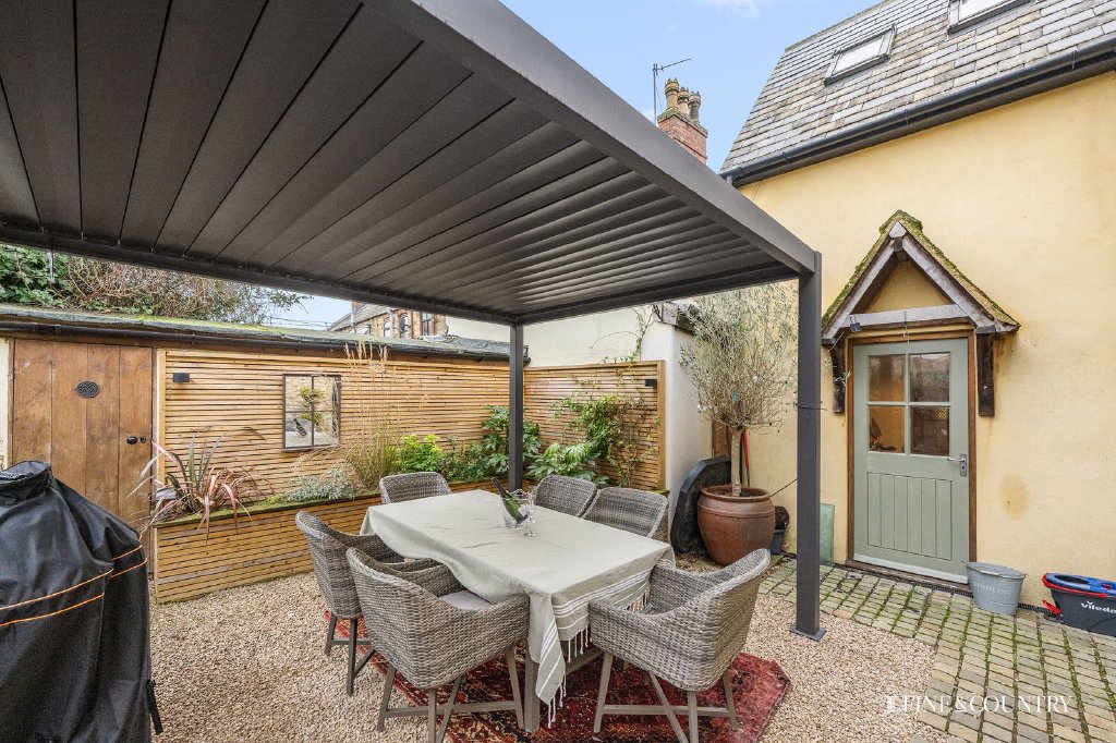 The connection between inside and outside has been carefully strengthened as part of the overall approach. Wide doors open from the main living areas to the landscaped terrace gardens, creating an easy indoor outdoor flow which comes into its own through the warmer months. The terrace is positioned to feel like an extension of the kitchen dining room, ideal for casual meals and relaxed hosting, while a further patio area provides an additional setting, with a gazebo offering shelter for alfresco dining or evening drinks. The outside space has been comprehensively redesigned to make it more usable and more secluded, enhancing the sense that this is a home where you can properly switch off.