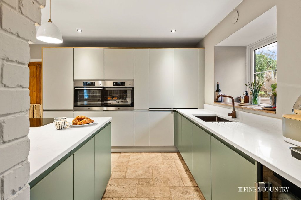 At the heart of the home sits the kitchen dining room, a key focus of the refurbishment and a space that beautifully balances contemporary design with the charm of a period house. The aesthetic is clean and considered, with crisp lines and integrated elements that maintain a streamlined feel. It is a room that works as well for family life as it does for entertaining, encouraging everyone to gather, cook, talk and linger.