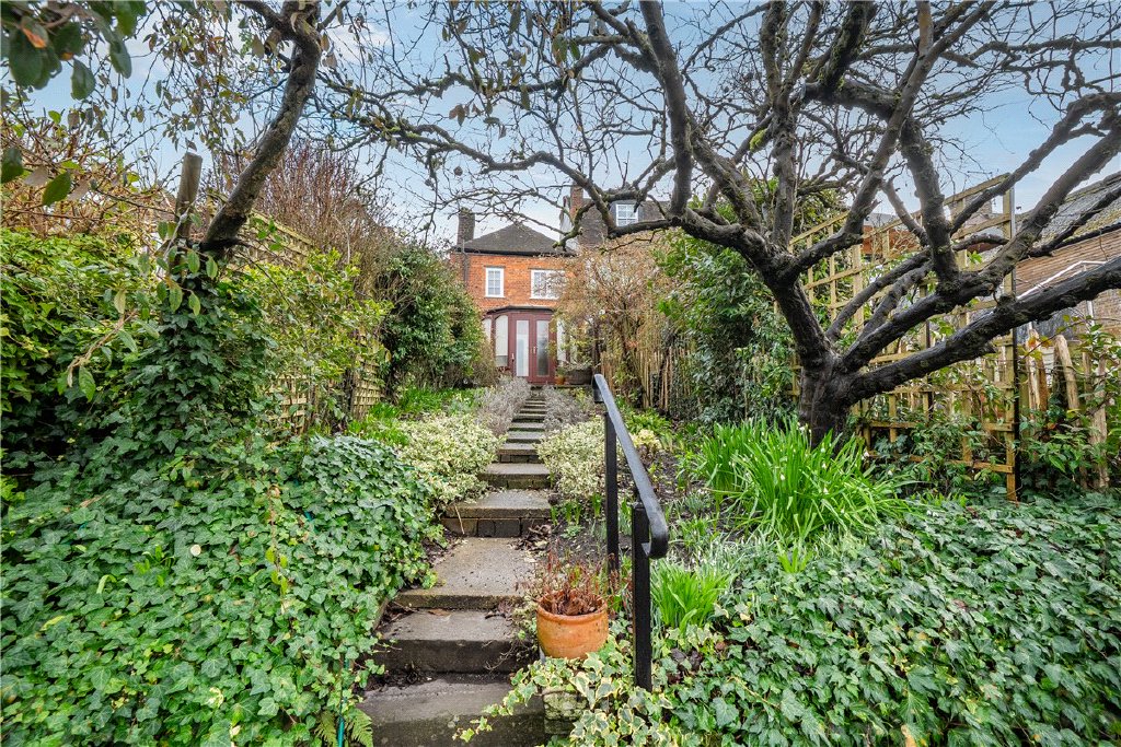 The property is distinguished by its exceptional riverside garden extending to over 100 ft. mature planting and winding pathways that lead from the house to the water’s edge. A patio seating area at the far end of the garden enjoys river views.