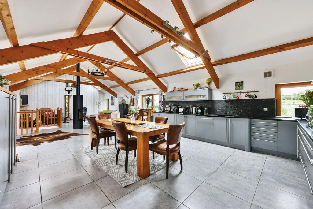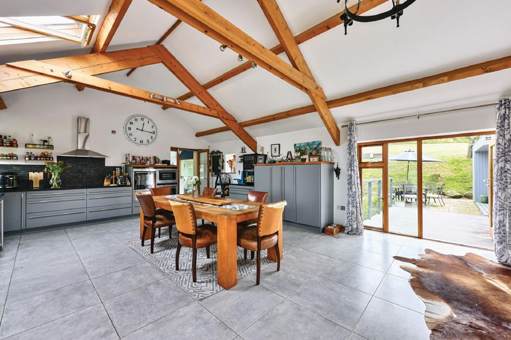 From here, three doors open to inviting reception rooms. The first beckons you into a generous 24-foot reception, complete with a practical wood-burning stove resting on a slate hearth, and triple-aspect windows showcasing the untouched rural landscape. At the far end of the room, French doors lead to an L-shaped balcony, a perfect retreat for savouring the beauty of nature. The room is spacious and filled with light, boasting an A-framed beamed ceiling and a skylight that further enhances its airy ambiance.