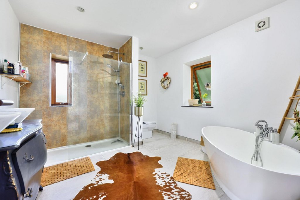 Externally, there’s an outdoor office/studio, South facing sun-terrace with a hydro spa, double garage with a large storage/gym area and 1.5 acres of paddock and enclosed gardens.