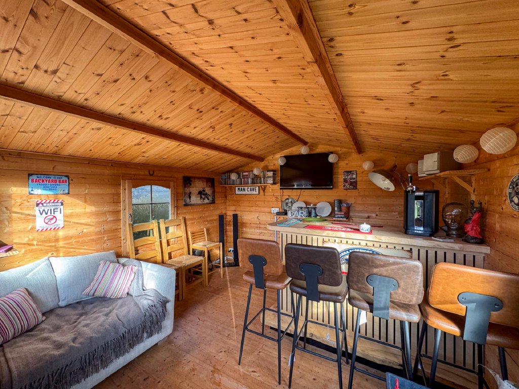 STEP OUTSIDE The rear garden is a true highlight of the property, offering a generous outdoor space with open countryside views and excellent versatility. A selection of well maintained outbuildings includes a charming home bar, perfect for entertaining or relaxing, alongside a substantial workshop and a self contained annex featuring its own family bathroom, ideal for guests, hobbies or home working.