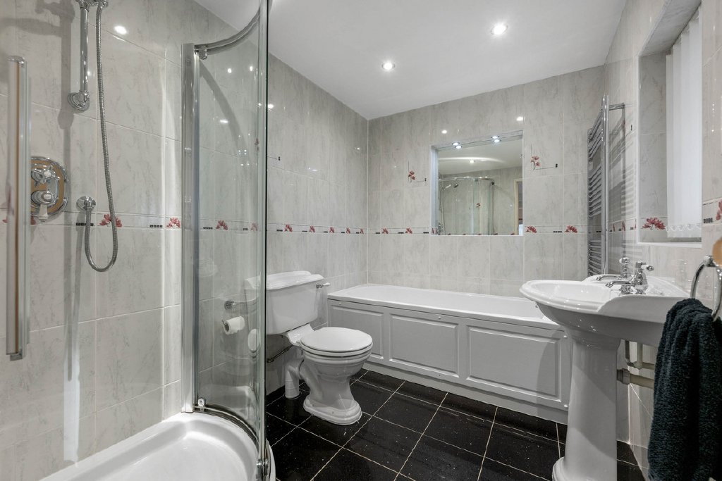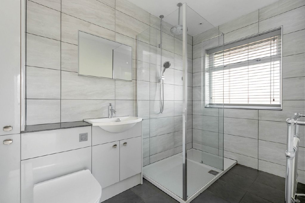 The kitchen and adjoining dining area present excellent potential to be combined into a large, open-plan living kitchen, if desired. The kitchen itself is fitted in a contemporary style, with integrated appliances, ample space for dining, and direct garden access. A further double bedroom, a separate study, and a family bathroom with a four-piece suite complete the accommodation.