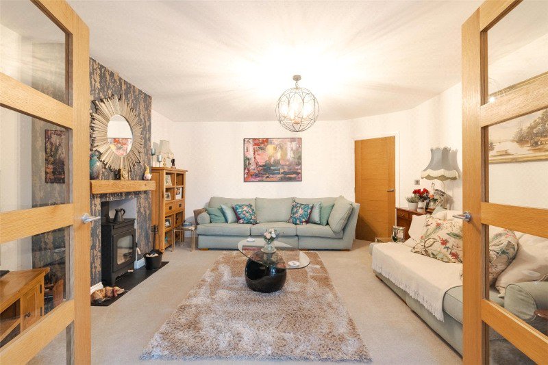 The living accommodation begins with a cosy lounge featuring a wood burner and glazed doors to the statement entertaining space, an impressive 26ft wide kitchen/breakfast/family room with a run of glazed sliding doors connecting to a large deck ideal for outdoor socialising. This expansive area allows space for a table and chairs and sofas. Rooflights in the vaulted ceiling allow light to flood in, and under floor heating beneath wood effect ceramic tiling provides warmth. The kitchen has an attractive range of units, a double sink, integrated dishwasher, fridge-freezer and 2 ovens. An island unit (with a breakfast bench) houses the induction hob.