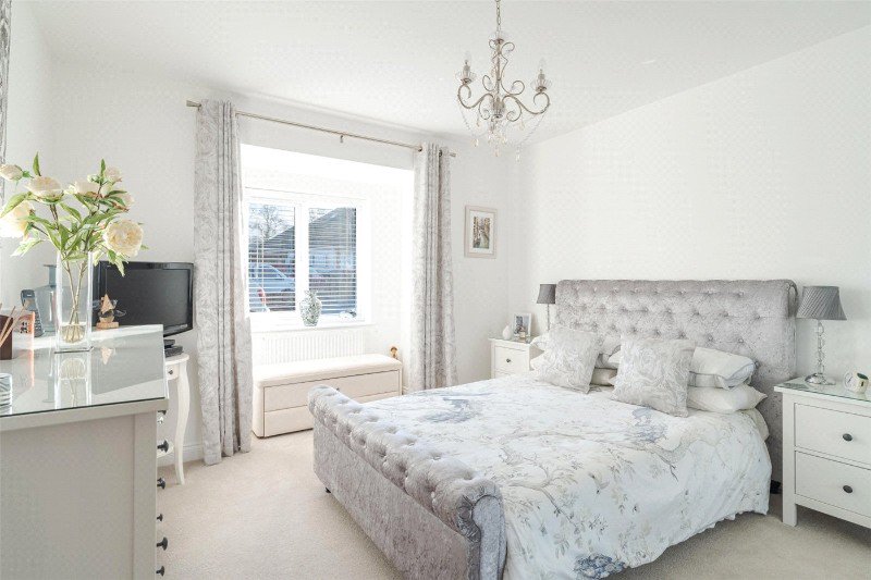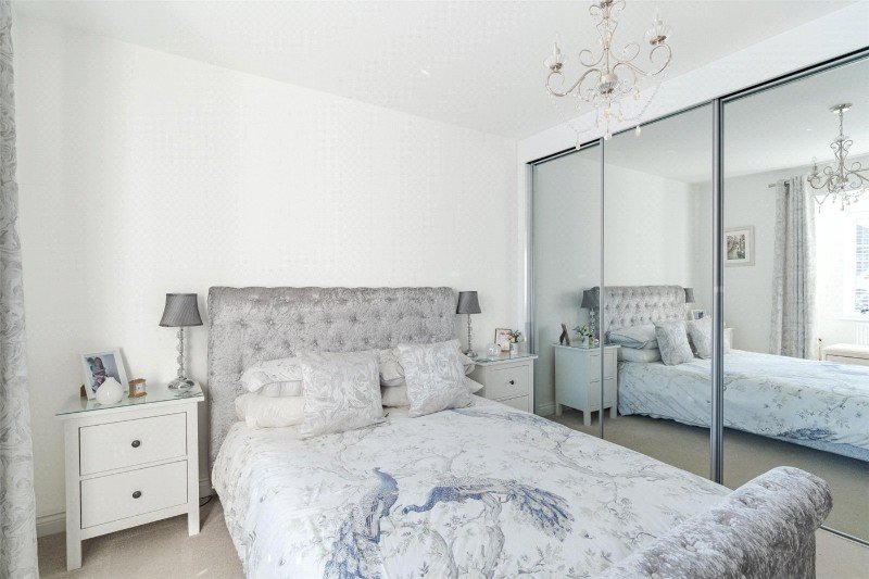 A black composite front door leads to a spacious entrance hall with a loft access and a large coat cupboard. To the front there are 2 spacious bedrooms. Bedroom 1 is a bright room with a partly vaulted ceiling, a dressing area (with mirrored wardrobes) and a well appointed en suite shower room. Bedroom 2 has an attractive box bay window and built-in mirrored wardrobes. Bedroom 3, to the side, is another spacious room with built-in mirrored wardrobes.