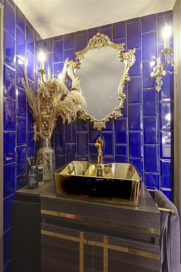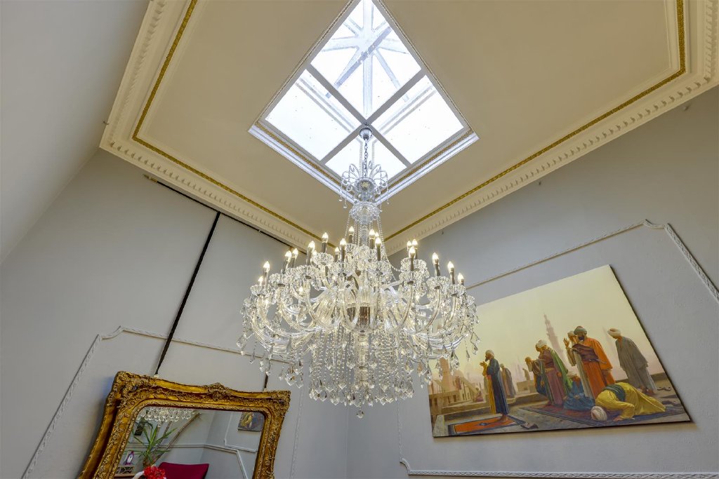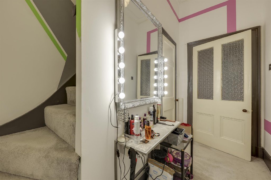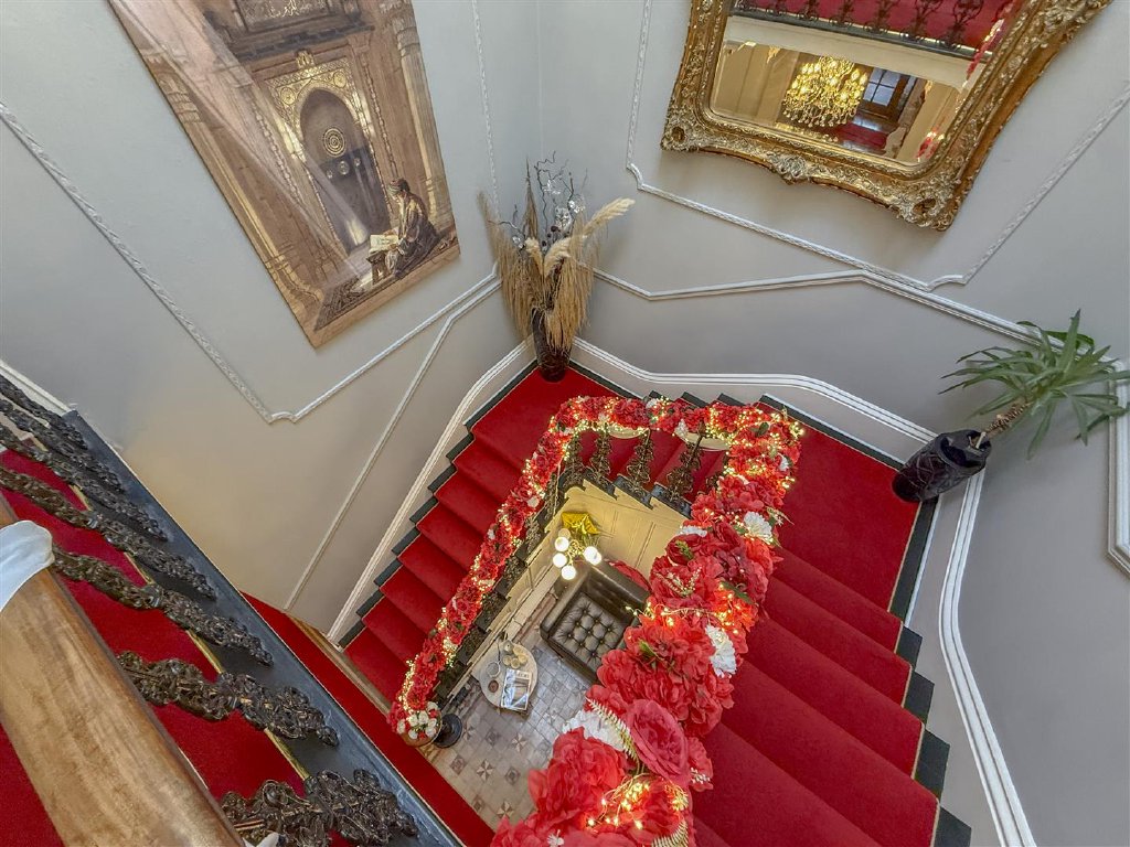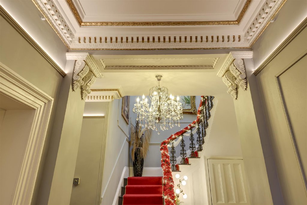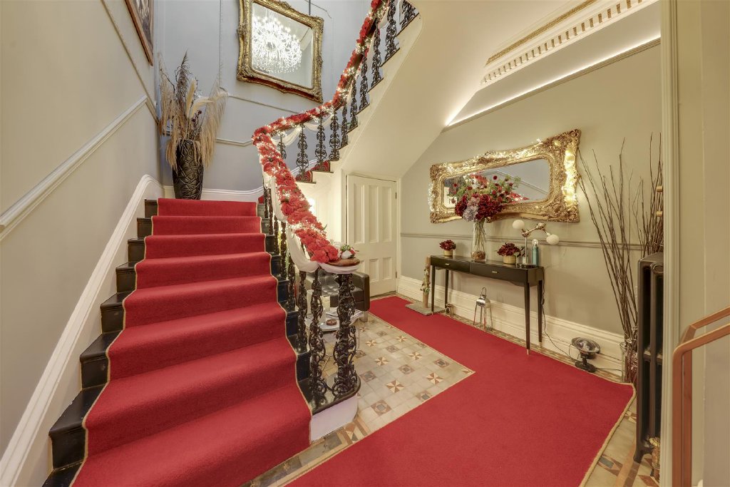 The ornate front door opens into a breathtaking entrance hall featuring mosaic tiled flooring, original detailing and a magnificent cast-iron sweeping staircase illuminated by a light well above. A striking guest cloakroom, finished in a bold black and gold design, sits just off the hallway.