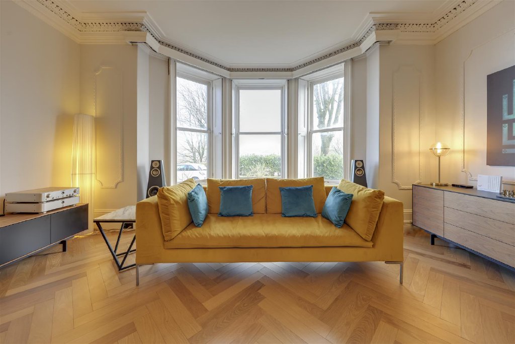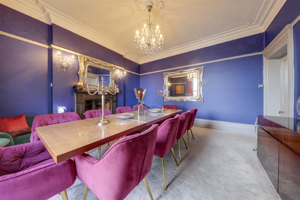 The principal living room occupies the former ballroom and extends to approximately 450 sq ft, with a large bay window, underfloor heating, herringbone hardwood flooring and intricate cornicing. A bespoke fireplace engraved with Bankside Hall forms a focal point, making this an exceptional space for entertaining and family living. Adjacent is a formal dining room of impressive proportions, featuring decorative plasterwork, a period fireplace and ample space for a large dining table.