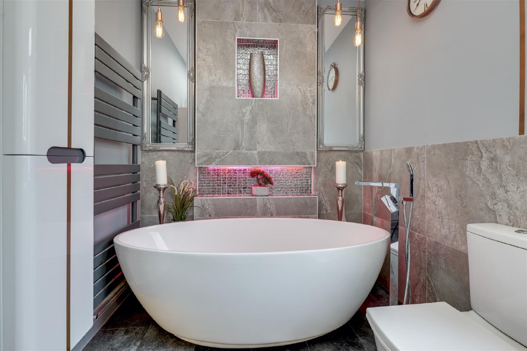 The bespoke kitchen has been commissioned by the current owners to an exceptional standard, featuring handcrafted cabinetry, granite work surfaces, premium integrated appliances, underfloor heating, peninsula breakfast bar and LED mood lighting-perfectly balancing contemporary luxury with period charm.