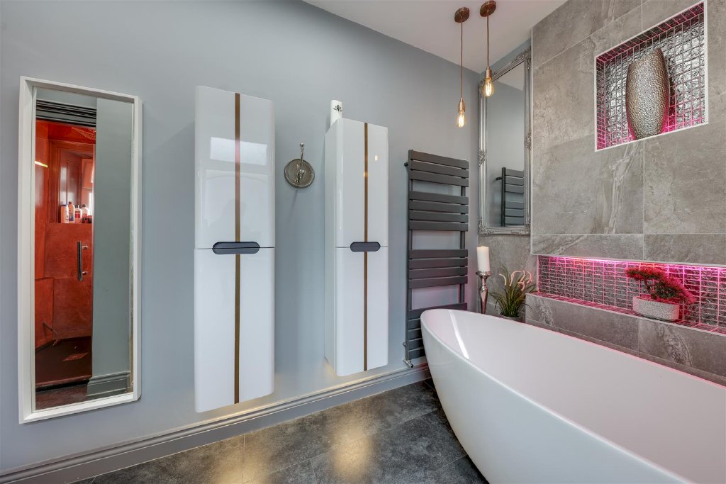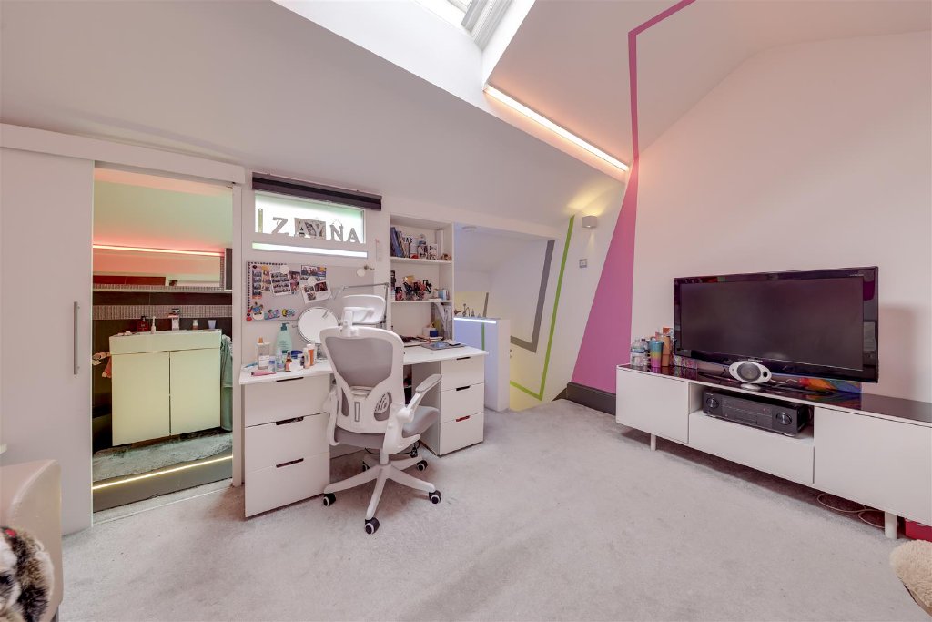 The first floor offers two substantial double bedrooms, a third well-proportioned bedroom and a stylish four-piece family bathroom. The principal bedroom suite is particularly impressive, extending to approximately 300 sq ft, with high ceilings and a bespoke mezzanine level incorporating storage, office space and an elevated sleeping area. The top floor reveals a fourth bedroom with en-suite shower room and walk-in wardrobe, ideal for guests or independent living.