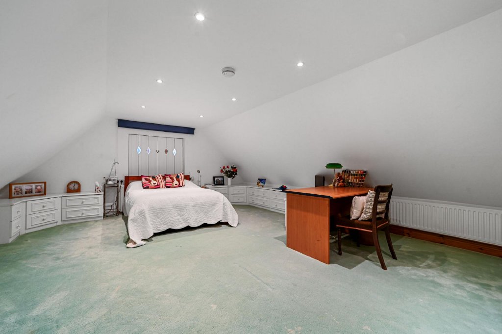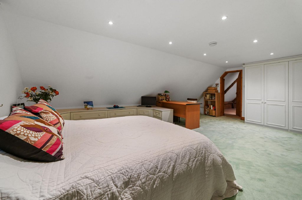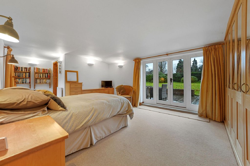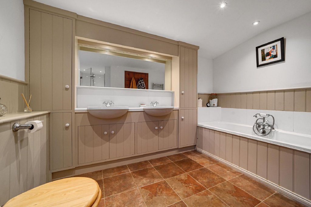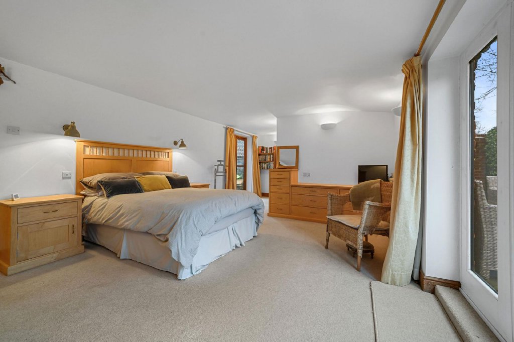 In the barn, cleverly separated from the social spaces, the three ground-floor bedrooms (one currently used for home working) all offer access to outside terraces with peaceful views. The study and guest bedroom, with its own en suite complete with underfloor heating, open out onto a terrace, created by the current owners to make the most of morning sun. The principal bedroom boasts his and hers sinks and tasteful, high end décor offering a serene, spa like ambience. The private terrace off this bedroom faces south and is used by the current owners anytime from lunchtime onwards to chase the sun – imagine sitting here with a G&T overlooking woodland and listening to birdsong. Stairs from the dining end of the great room lead to a landing, ideal as a spot for peaceful ironing, and leads via library shelving to a secret hideaway. This makes an ideal teenager's den, large enough for bed, desk, and social space and with its own private bathroom and it also lends itself well as a nursery suite for visiting families with young children.