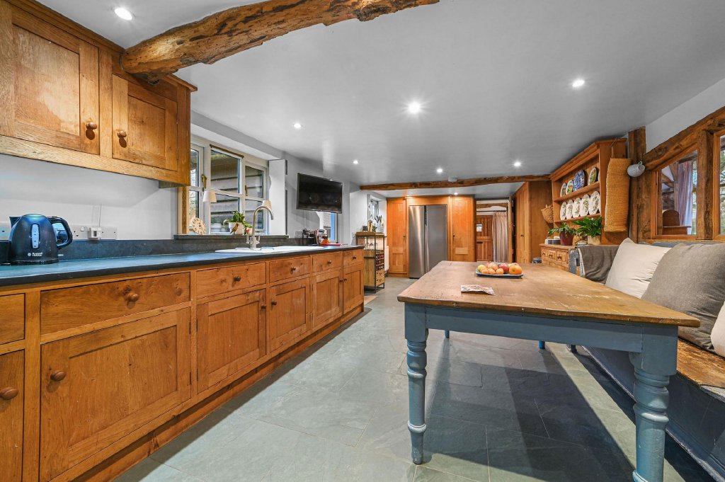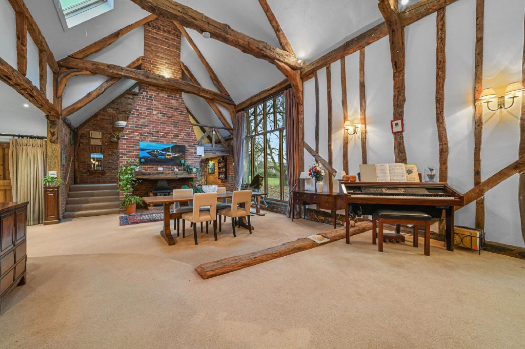 Stepping into a thoughtful porch, there is space to decamp muddy boots after a country stroll, such a necessity in a country residence. From here you enter a stunning kitchen with practical slate floor, bespoke window shutters, crafted cabinets blending with beams, plus modern double fan ovens, an induction hob, and space for an American-style fridge freezer, allowing chefs all they need to cook up a family feast, with a large table to enjoy casual dining. It's a favourite spot in summer, remaining cool yet light - the perfect place to escape the heat of the day. The cloakroom is just to the side, and from the kitchen you step into the vast, vaulted reception room, with magnificent beam work and thoughtfully zoned spaces. A book nook or library area, with two armchairs perfectly positioned for morning papers and garden views, sits alongside a formal dining area enjoying picture window vistas of the grounds and a log burner. A music zone and a cosy sofa section by a further fireplace, overlooking trees and shrubs, make this the go-to spot in winter. The impressive fireplace runs floor to ceiling with exposed brickwork and a small staircase leading to a minstrel's gallery. To the right of the sofas is cupboard space known as the "priest's bolt hole". This vaulted space is wonderfully light, with floor-to-ceiling windows, and makes a fabulous entertaining area when family and friends come together for celebrations.