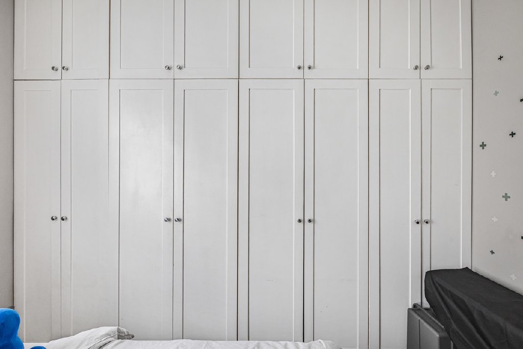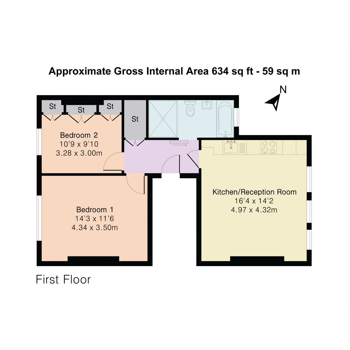 The property features a spacious open-plan kitchen/reception room with modern fitted units and space for dining and lounging. There are two generous double bedrooms, a contemporary bathroom with a bath and overhead shower, and multiple built-in storage cupboards throughout, providing excellent practicality. Positioned on the first floor, the apartment offers a sense of privacy and security.