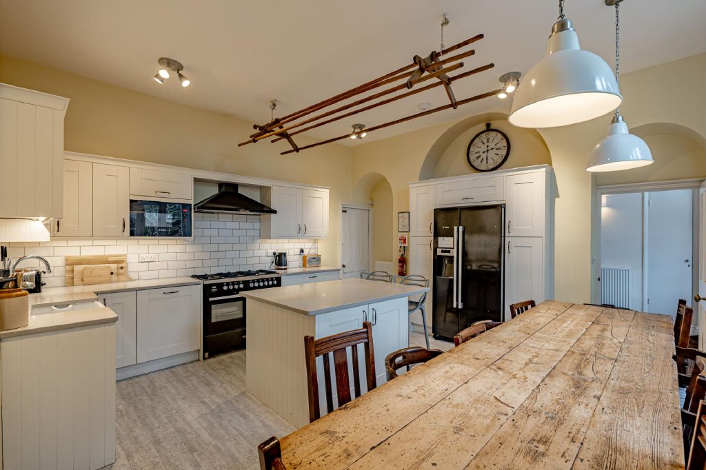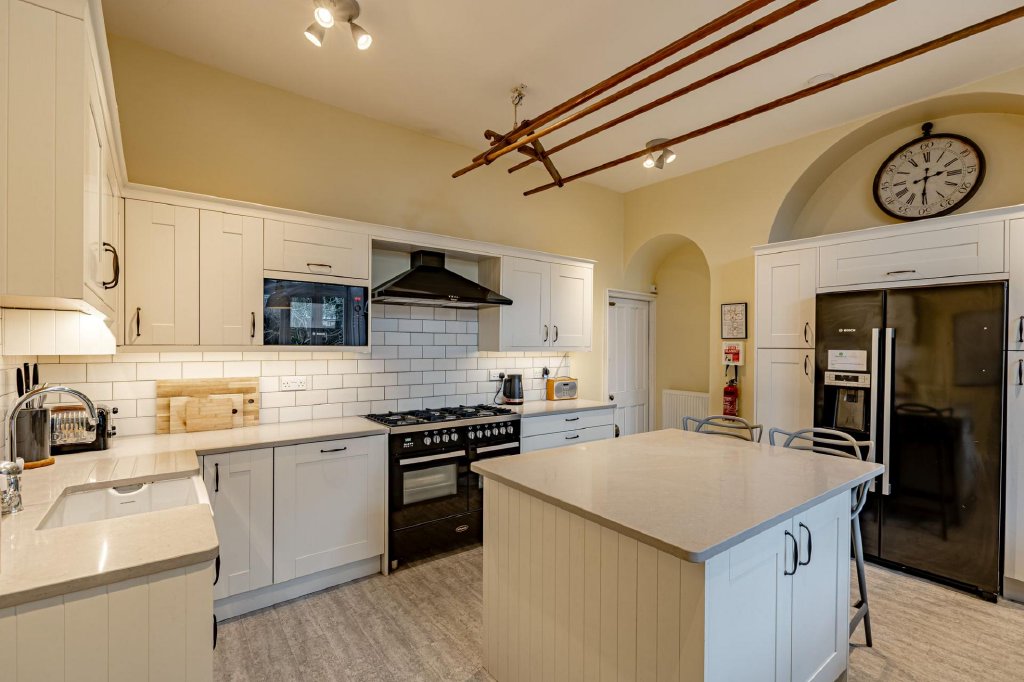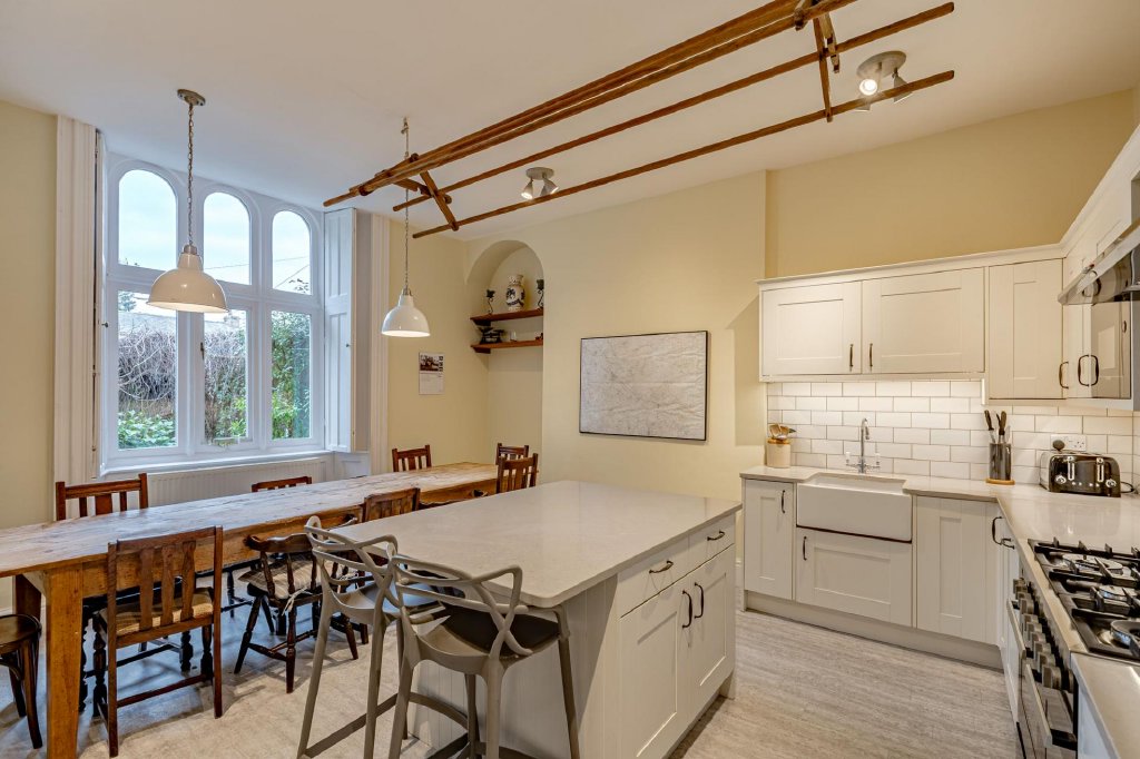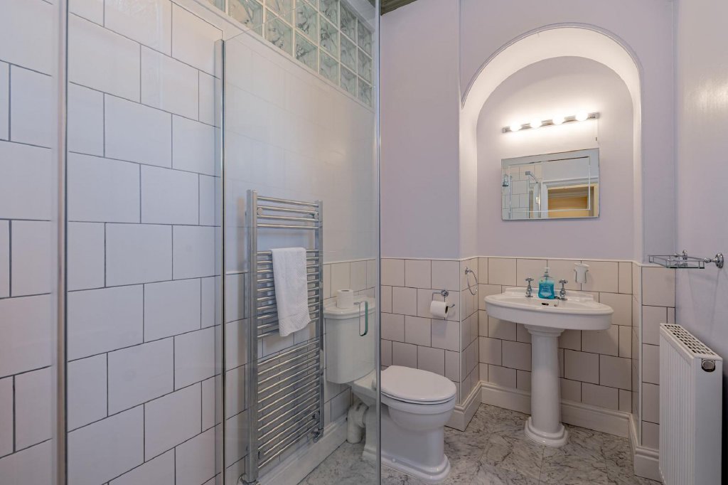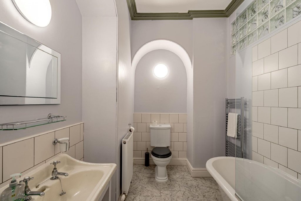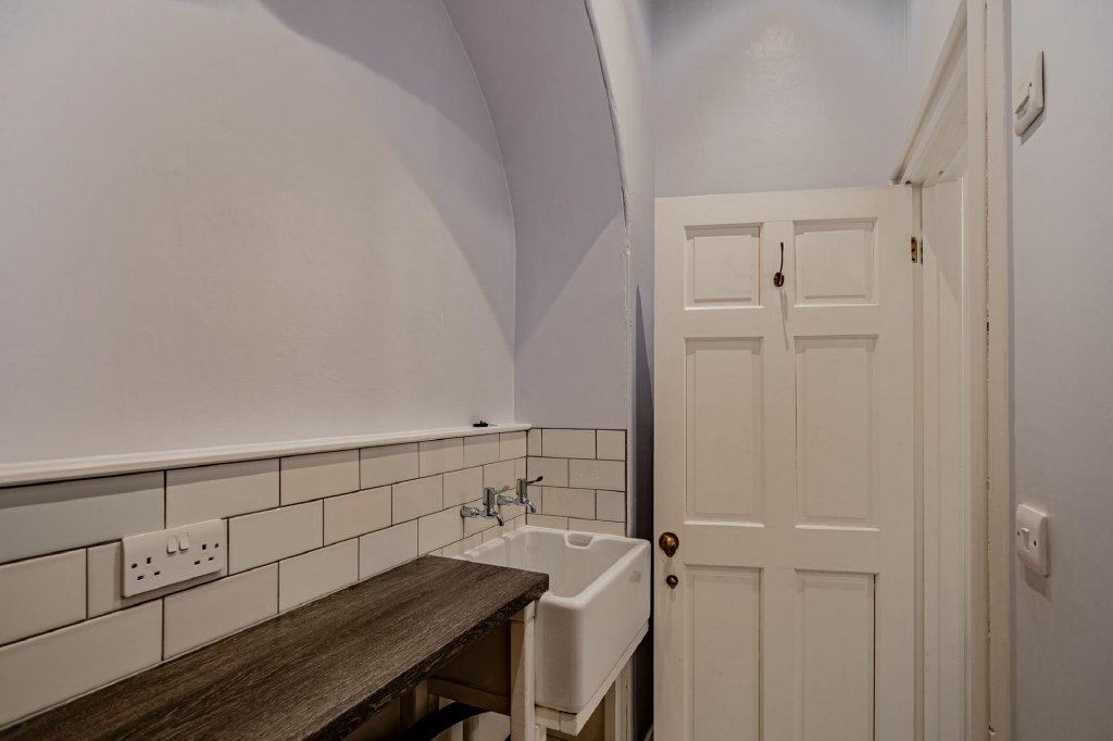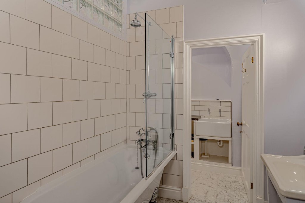 Also on this floor are two bathrooms. The first features a roll-top bath with shower over, WC, wash basin and heated towel rail. The second has a walk-in shower, with WC, wash basin and heated towel rail. Both are fitted with classic heritage white fixtures and are well maintained. There is also a utility area with Belfast sink and a large cupboard provides space for white goods.