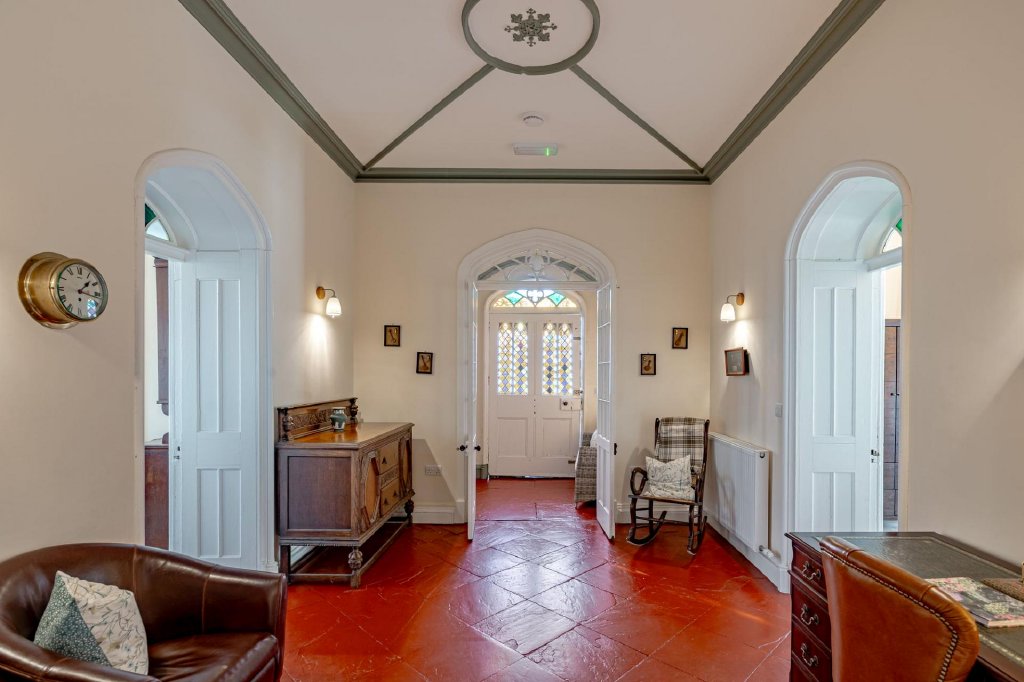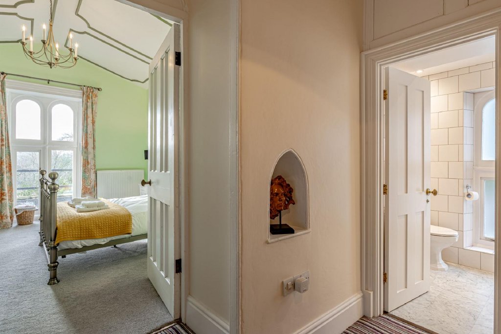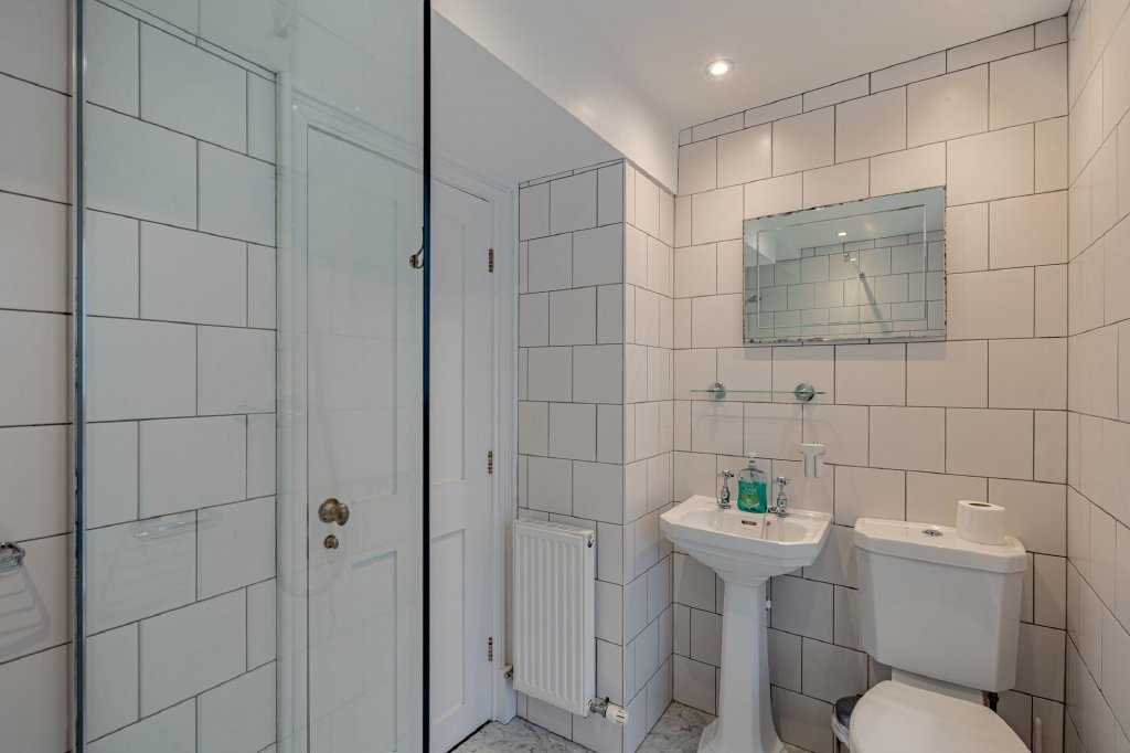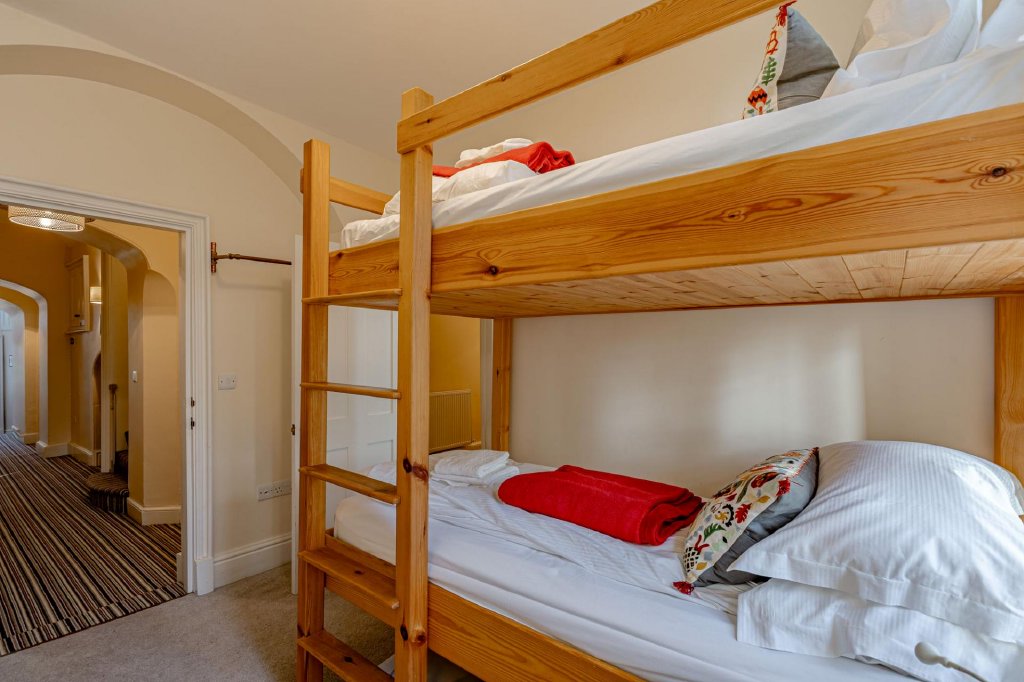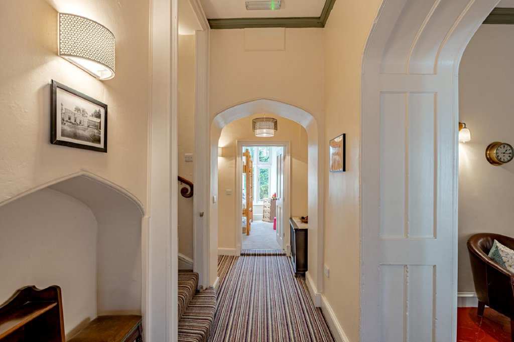 The upper floor hosts two further generous bedrooms, both rich in character with period ceilings, one decorative and period fireplaces. There is an additional single room on this floor, currently fitted with bunk beds. The third bathroom is fully tiled and features heritage-style fittings, including a walk-in shower, WC, wash basin and heated towel rail.