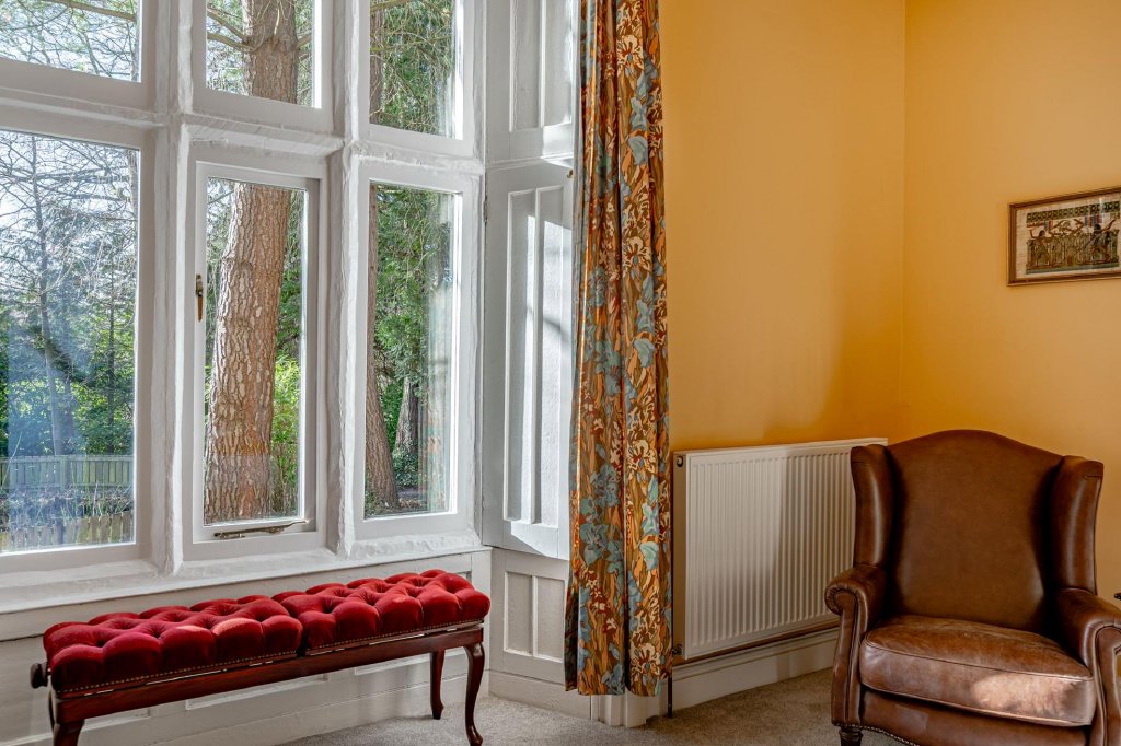 There are two sizeable reception rooms connected by a welcoming hallway leading to the vestibule, which originally served as the main entrance. One reception room is currently used as a bedroom; both offer views over the front of the property, period fireplaces and decorative ceilings. The main sitting room is cosy, with dual-aspect windows and a gas fire set in a marble surround. Original details such as the servants’ bells and decorative timberwork add further character and charm.