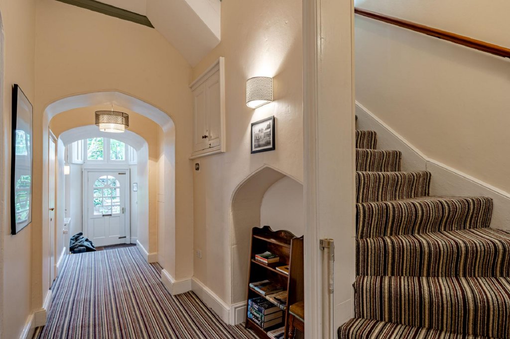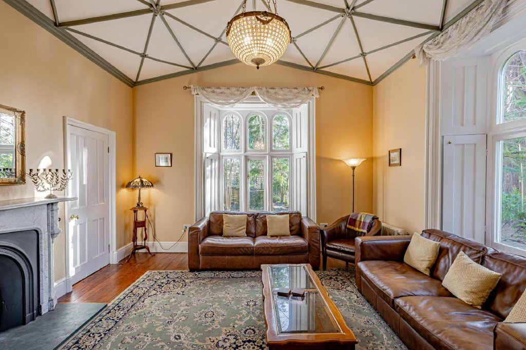 The house makes a striking first impression with its castellated façade. High ceilings and triptych and diptych windows flood the interior with natural light and offer delightful views of the mature gardens.